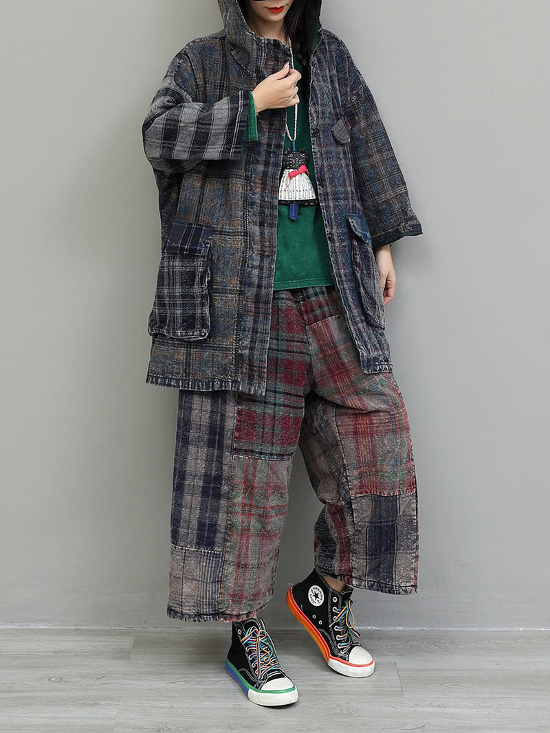 Women Autumn Retro Plaid Spliced Cotton Suits