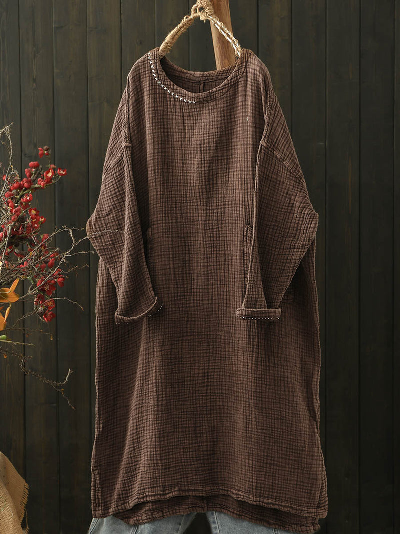 Women Autumn Retro Pure Color Folds O-Neck Cotton Dress