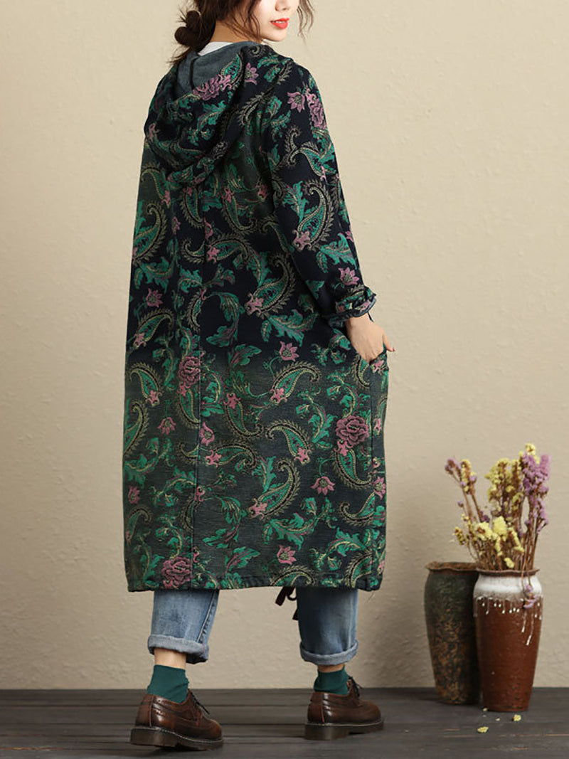 This product is crafted with 100% cotton material and features a vintage flower pattern. The hooded collar and full raglan sleeves add a retro touch. perfect for the autumn and spring seasons.