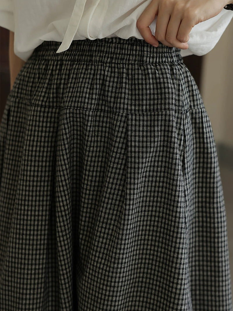 Women Autumn Vintage Lattice A-Shape 100%Cotton Skirt