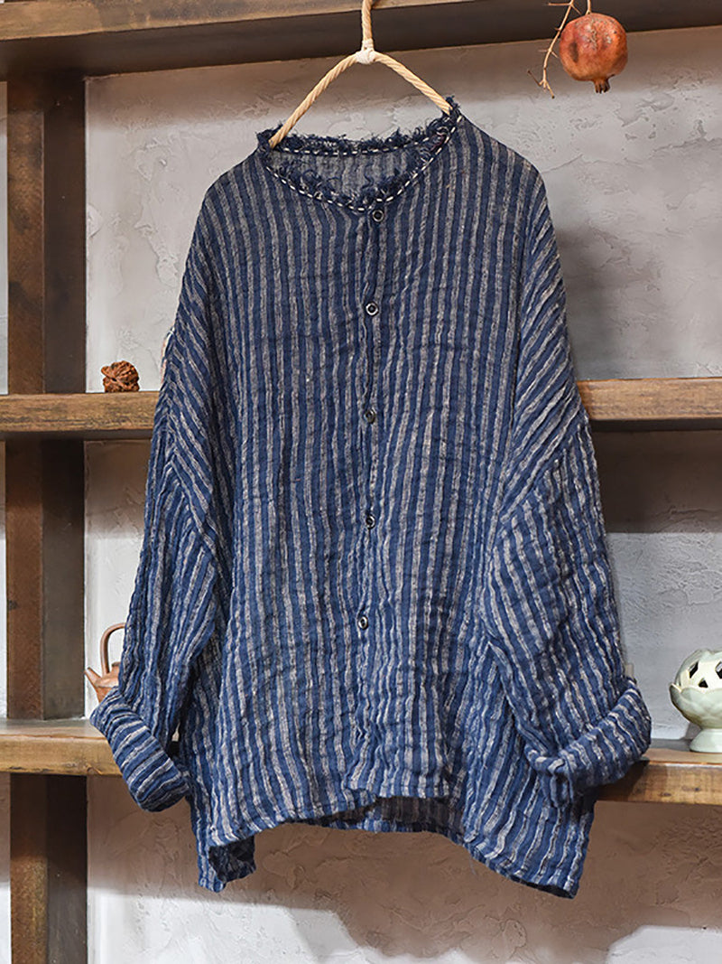 Plus Size Women Autumn Vintage Stripe Raw-edge Linen Shirt