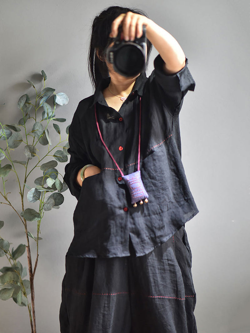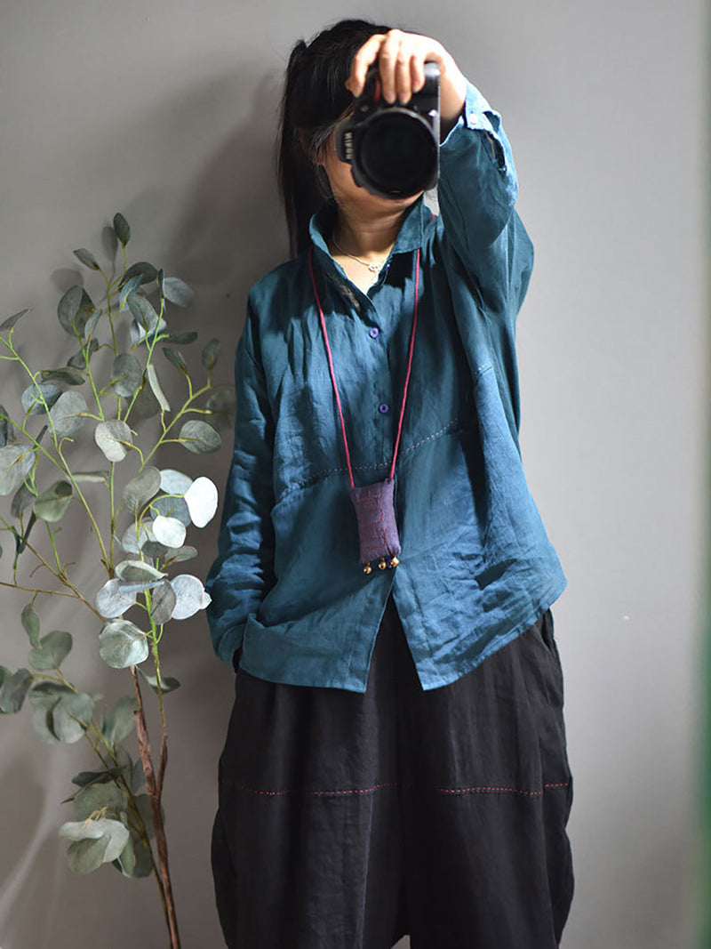 It features a turn-down collar and full raglan sleeves. making it suitable for casual wear during the spring and summer seasons.