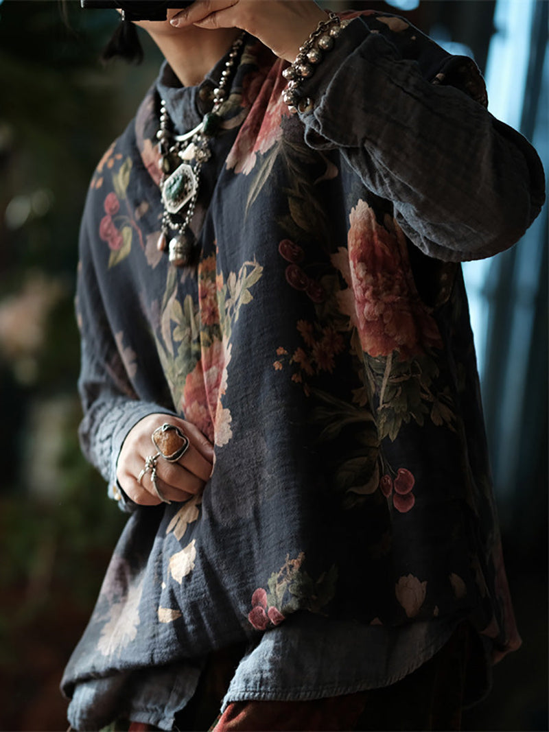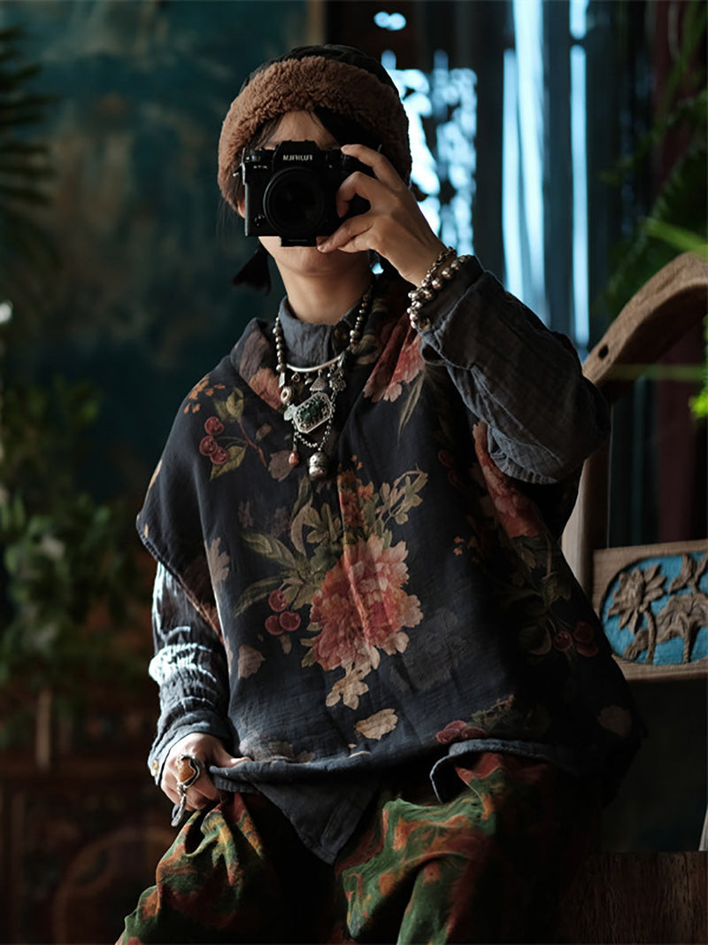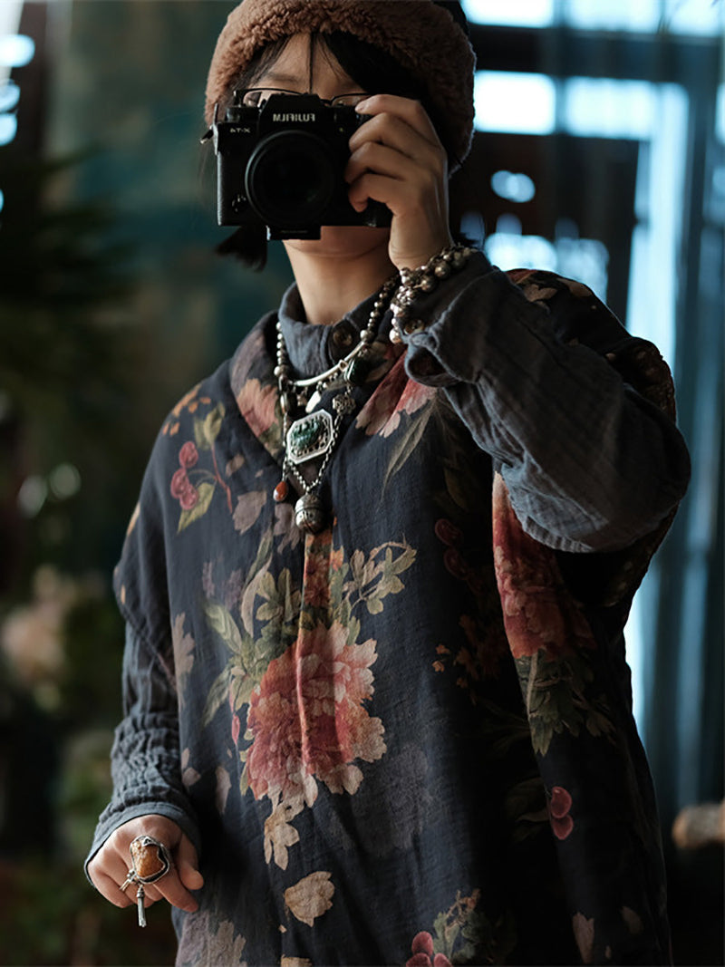 This product features a vintage style with a V-neck collar and a 100%cotton material adorned with floral patterns. making it perfect for the autumn and winter seasons.