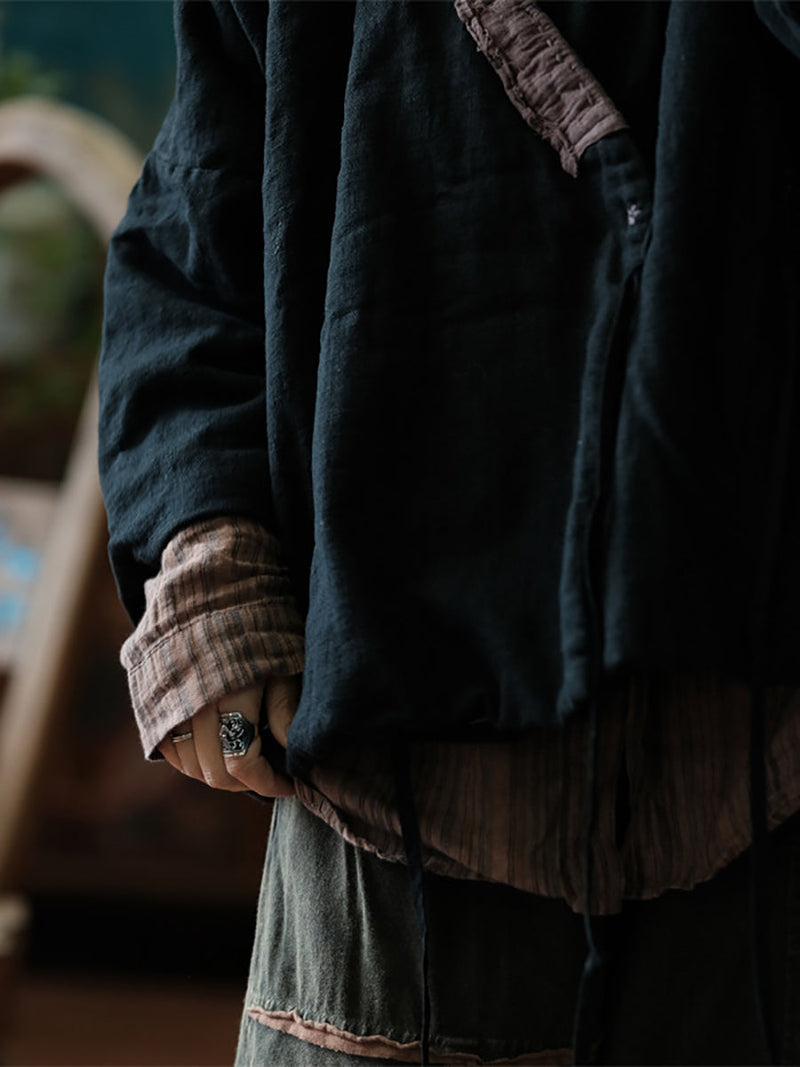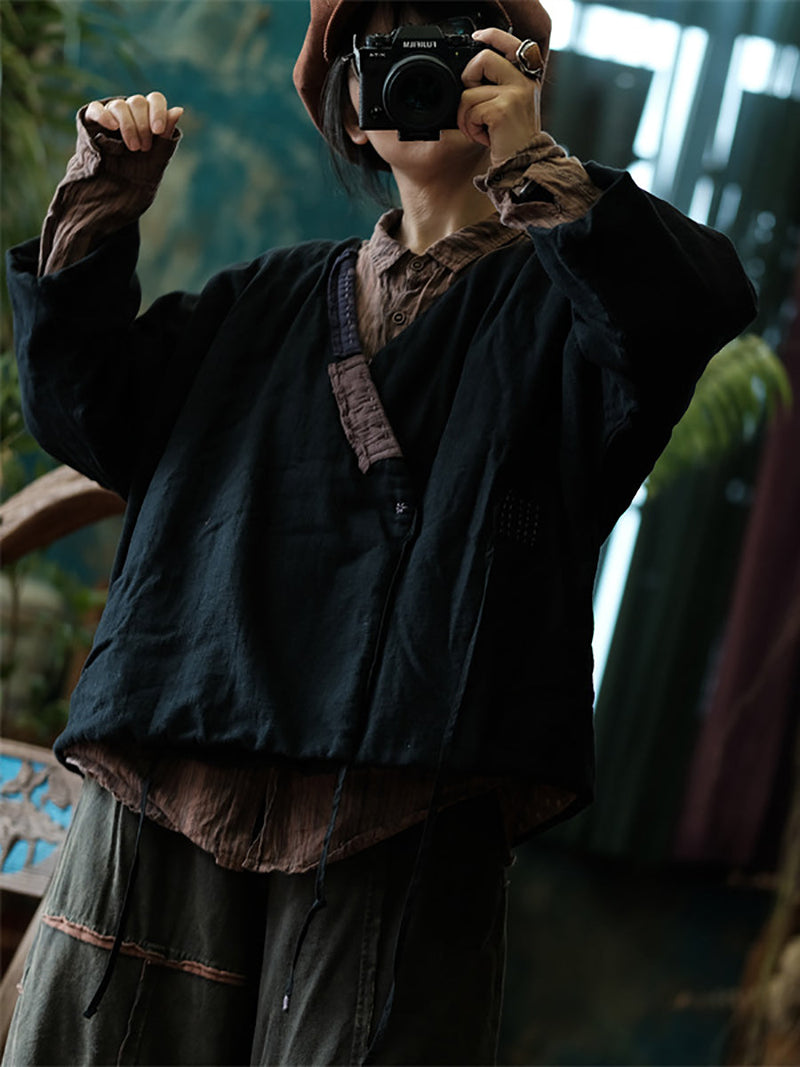 This piece is made of linen with a solid pattern and a v-neck collar. With full raglan sleeves in an ethnic style. it is perfect for the autumn and winter seasons.