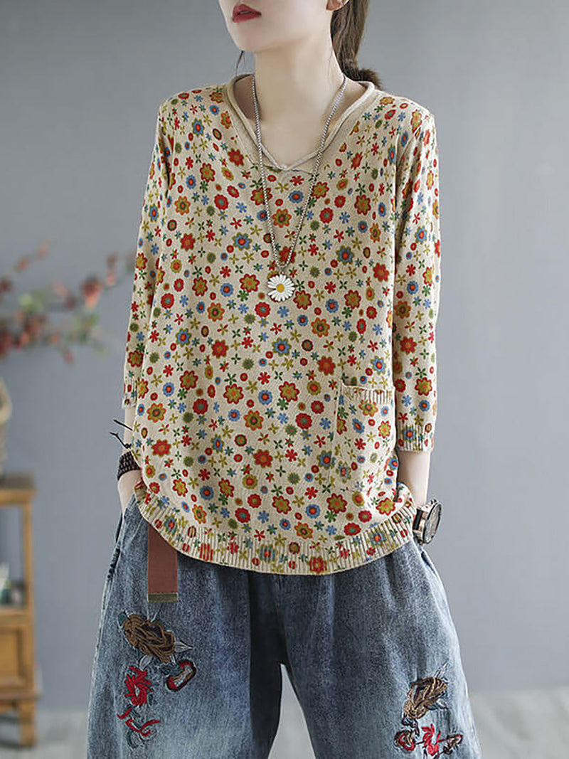 Plus Size Floral Spring Knitted Casual Print Pocket Sweater
