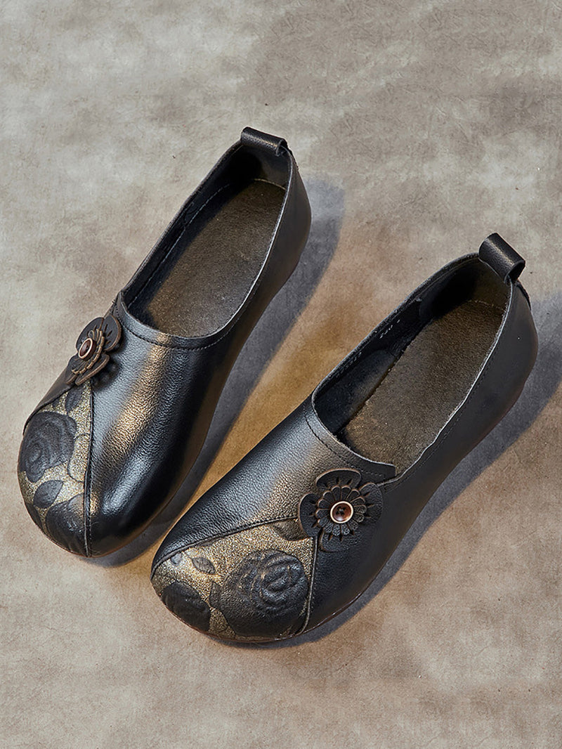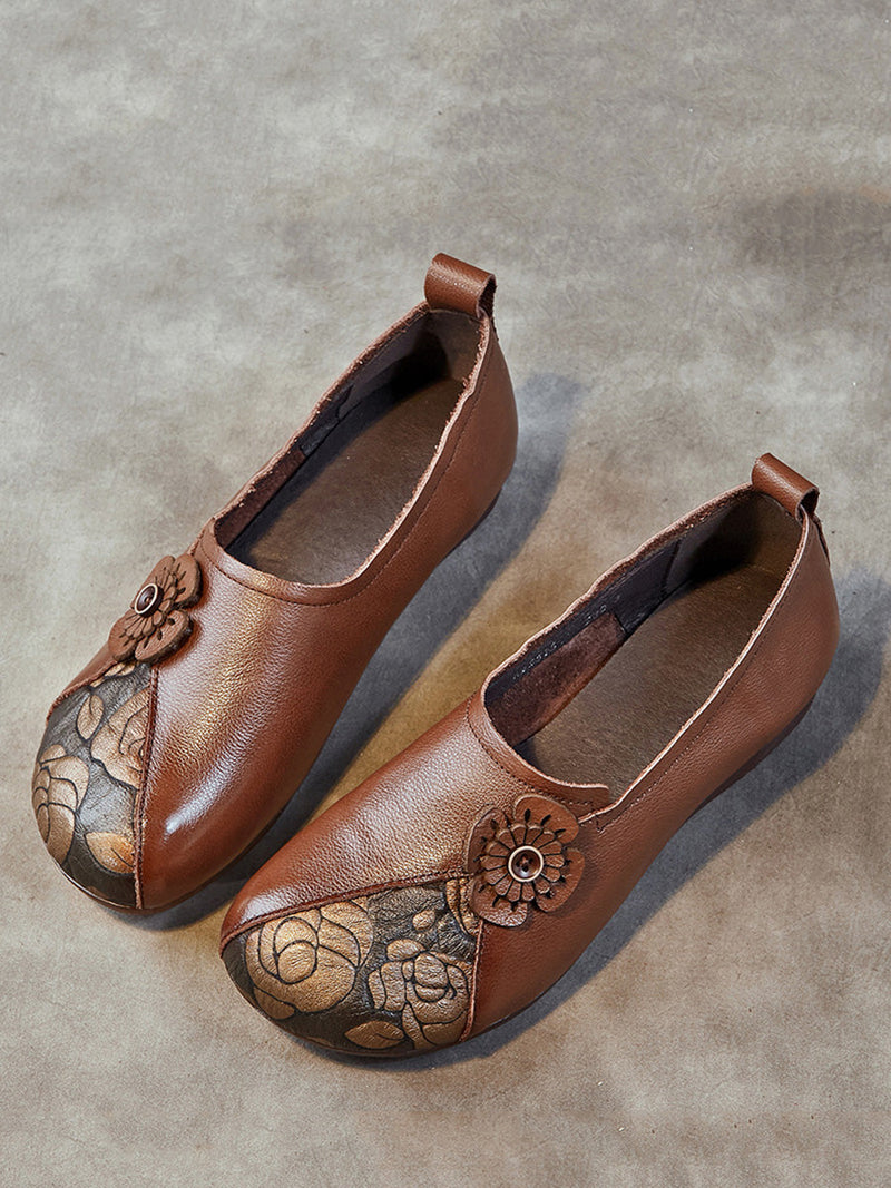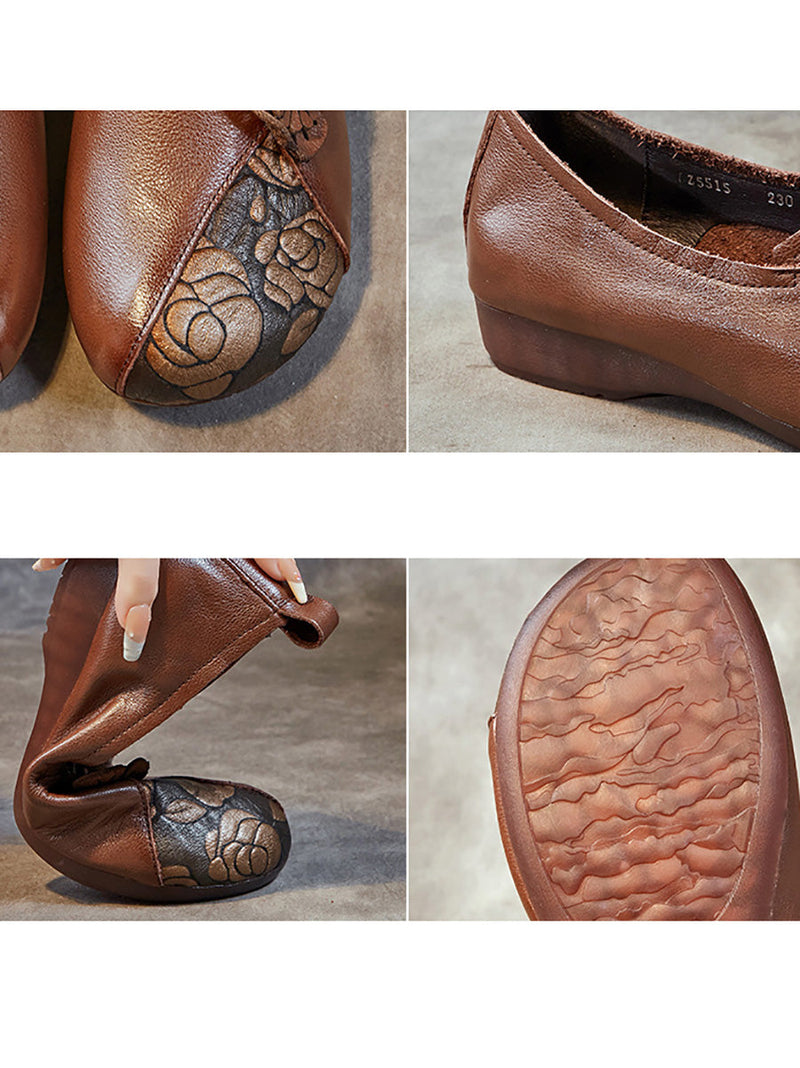 Women Retro Flower Leather Spliced Low Heel Shoes