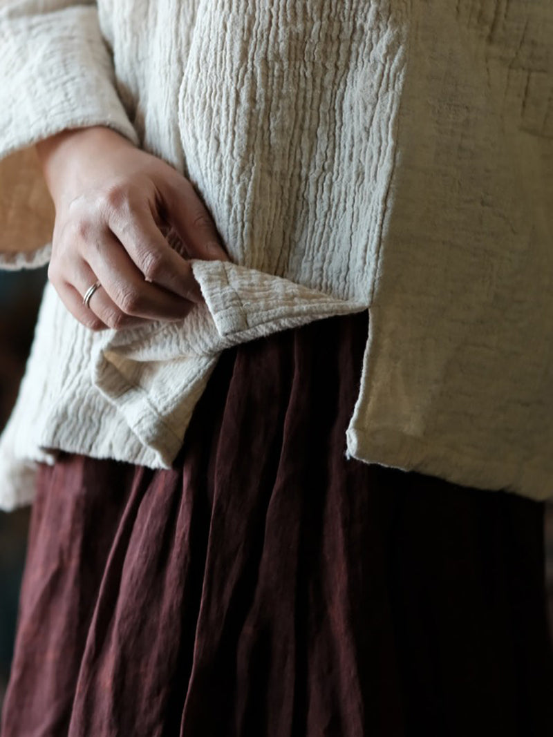 This shirt is crafted from a blend of linen and cotton. with a unique floral pattern and an O-neck collar. The sleeves are full length with a raglan style and have a distinct artistic quality to them. Perfect for the spring and summer seasons. this shirt is a great addition to any wardrobe.