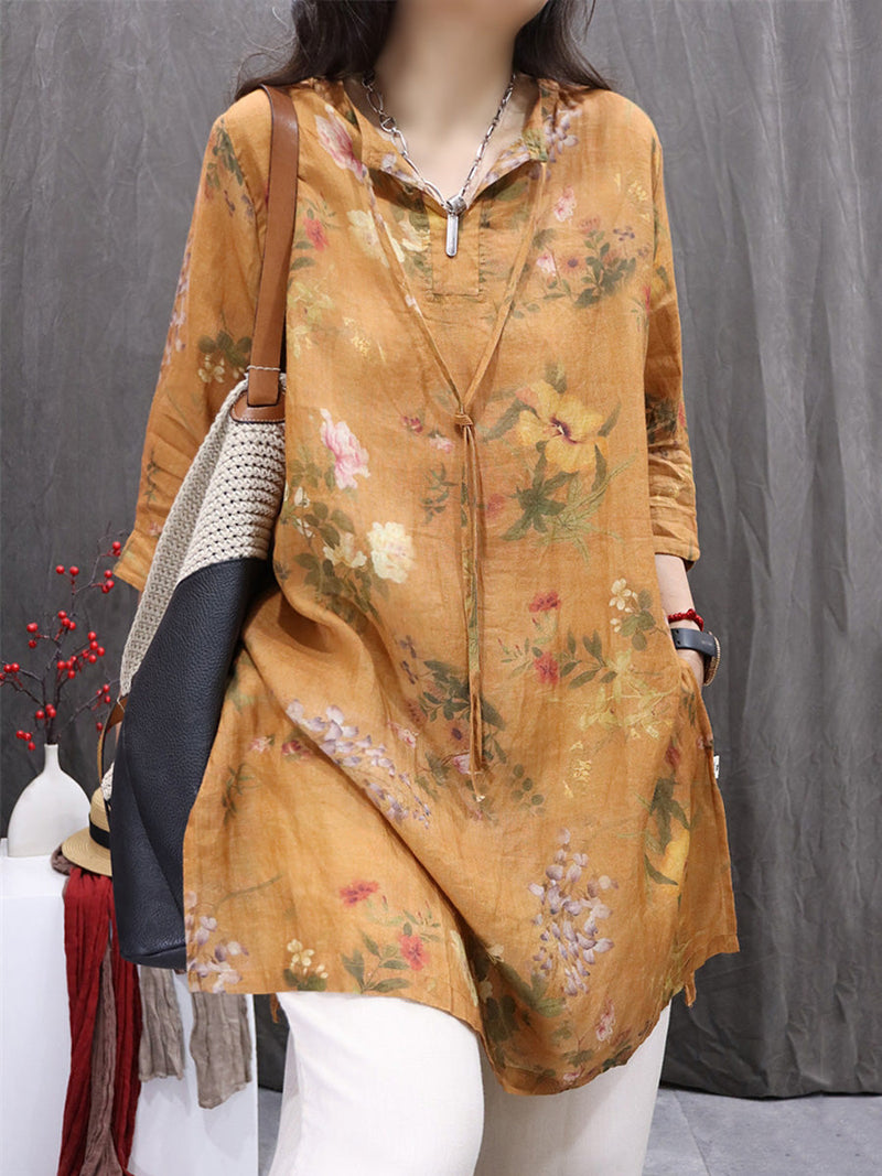 Women Spring Artsy O-Neck Flower 100%Ramie Shirt