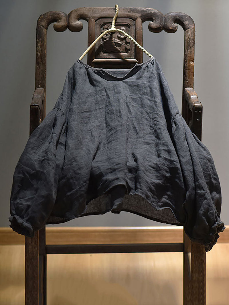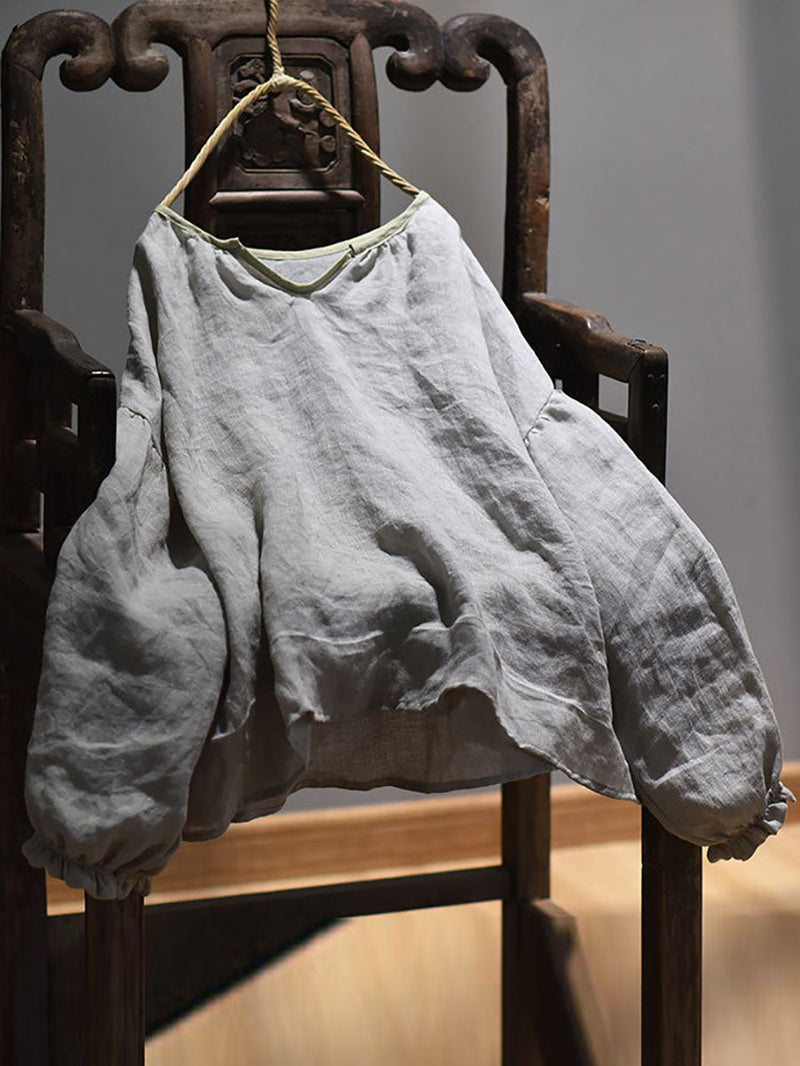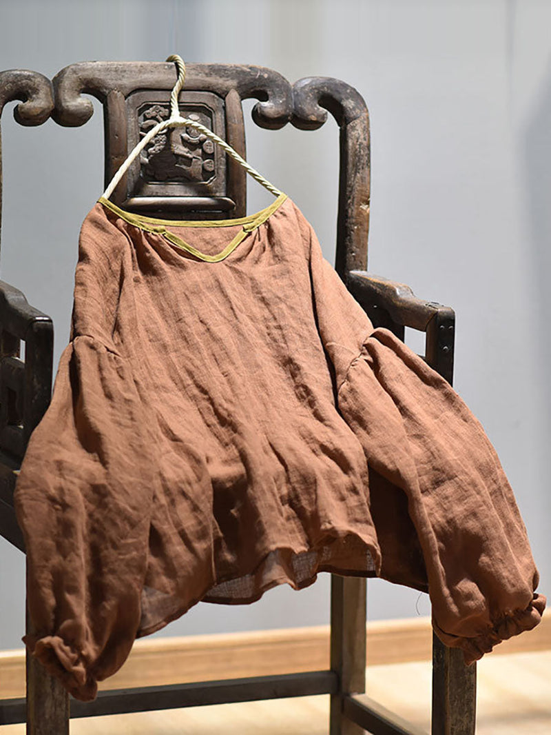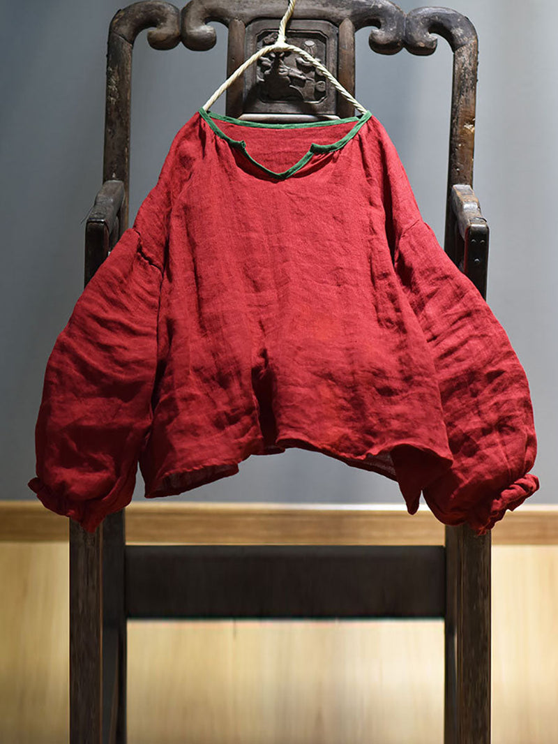 This linen shirt features a solid pattern. V-neck collar. puff sleeves. raglan sleeves. and a vintage style. It is perfect for the spring season and exudes a classic. retro vibe.