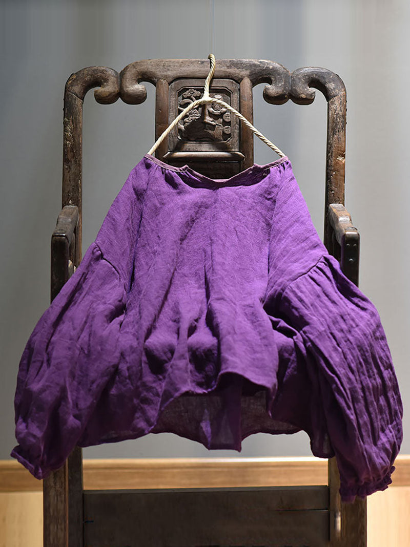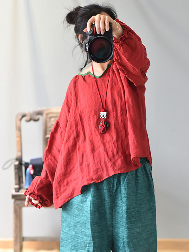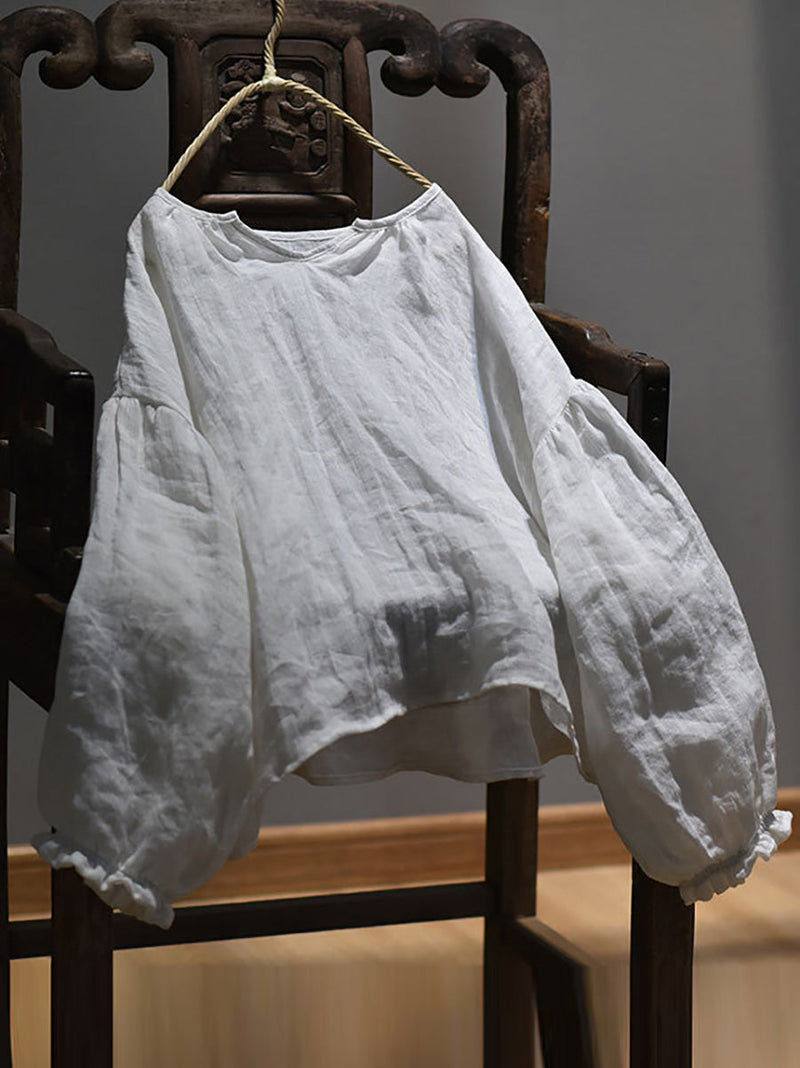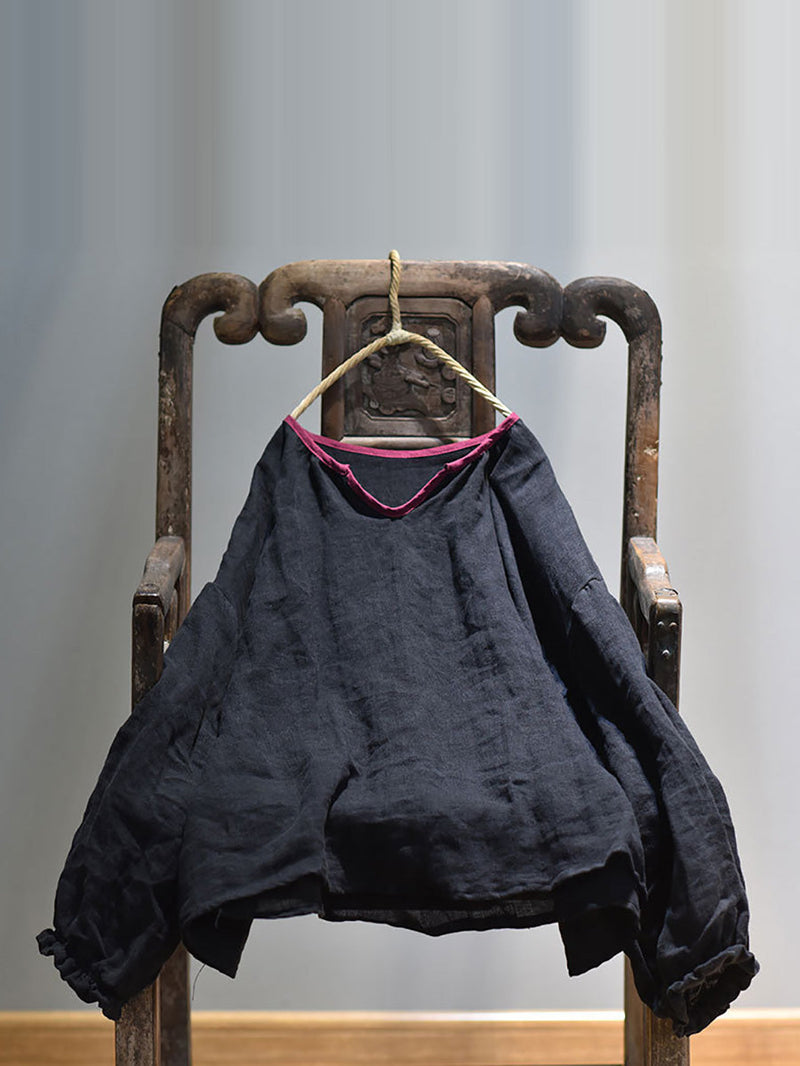 This linen shirt features a solid pattern. V-neck collar. puff sleeves. raglan sleeves. and a vintage style. It is perfect for the spring season and exudes a classic. retro vibe.