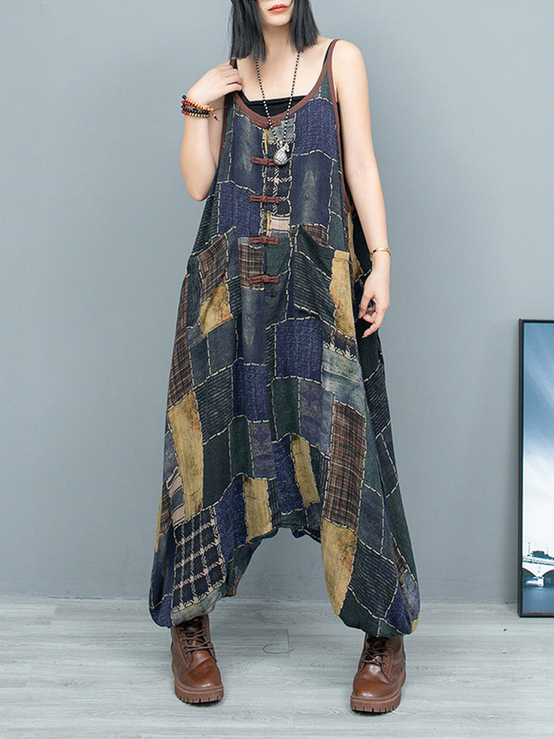 Plus Size Women Spring Vintage Flower Loose Jumpsuits