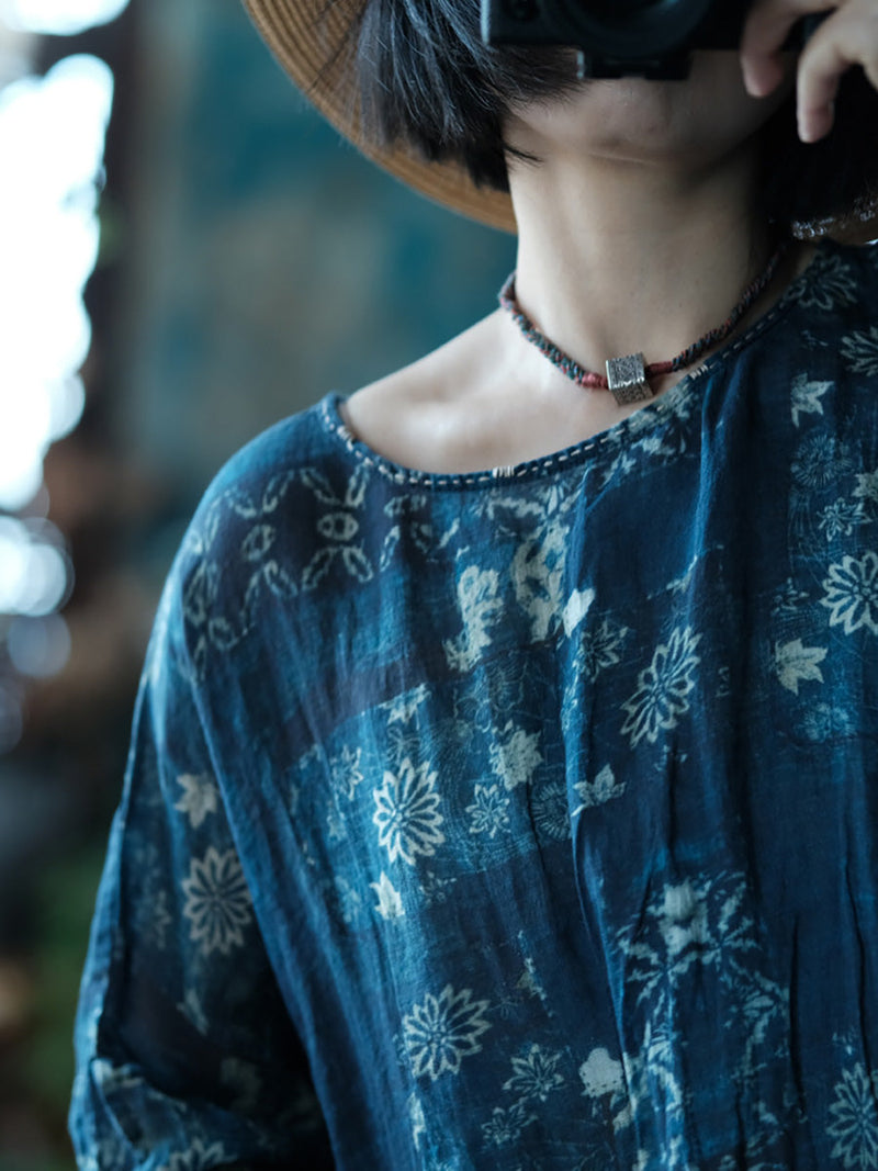 This dress is made of 100% Ramie fabric. with an O-Neck collar and a beautiful flower pattern. The Raglan sleeves extend to a full length. while the dress itself falls to the calf. The unique feature of this dress is the spliced design. making it perfect for both Spring and Summer seasons.