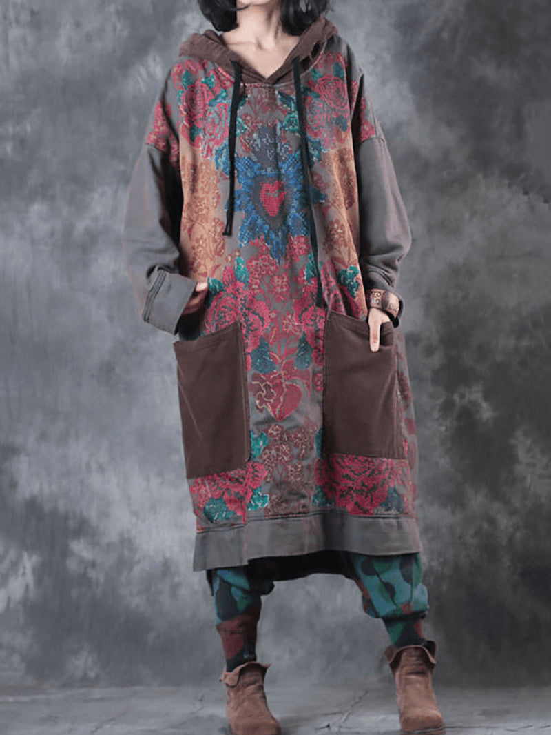 Expertly crafted from cotton. this dress features a hooded collar and raglan sleeves. as well as a beautiful flower pattern. The raglan sleeves and knee-length cut make it perfect for both summer and spring. while the added highlight of a pocket adds functionality to the design.