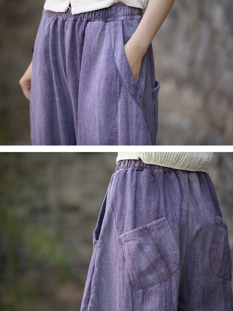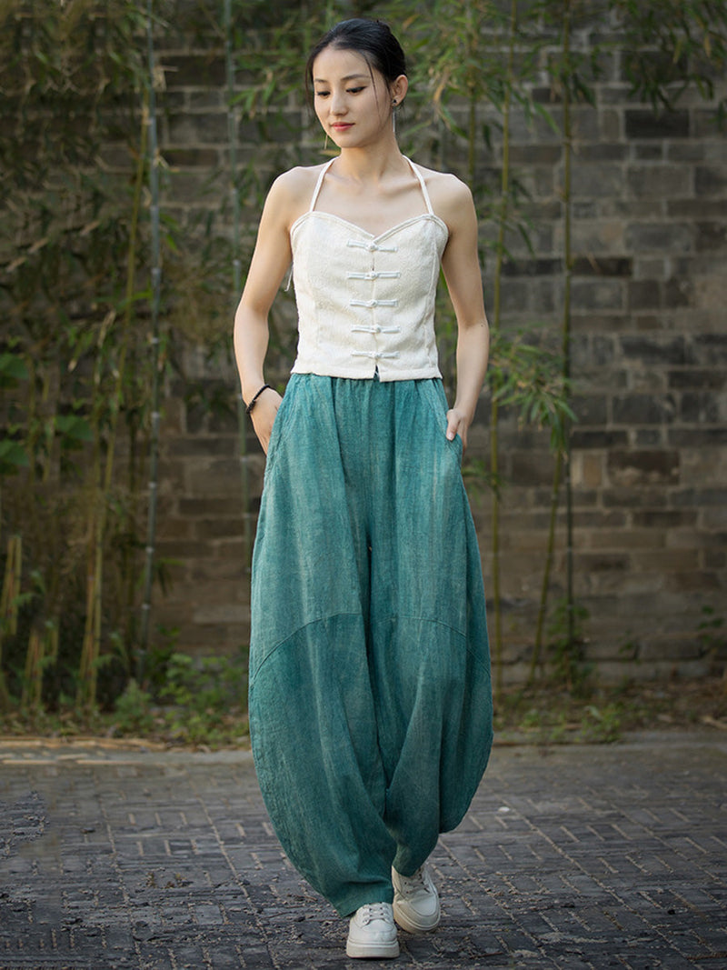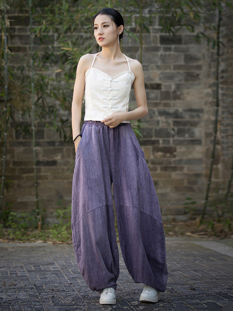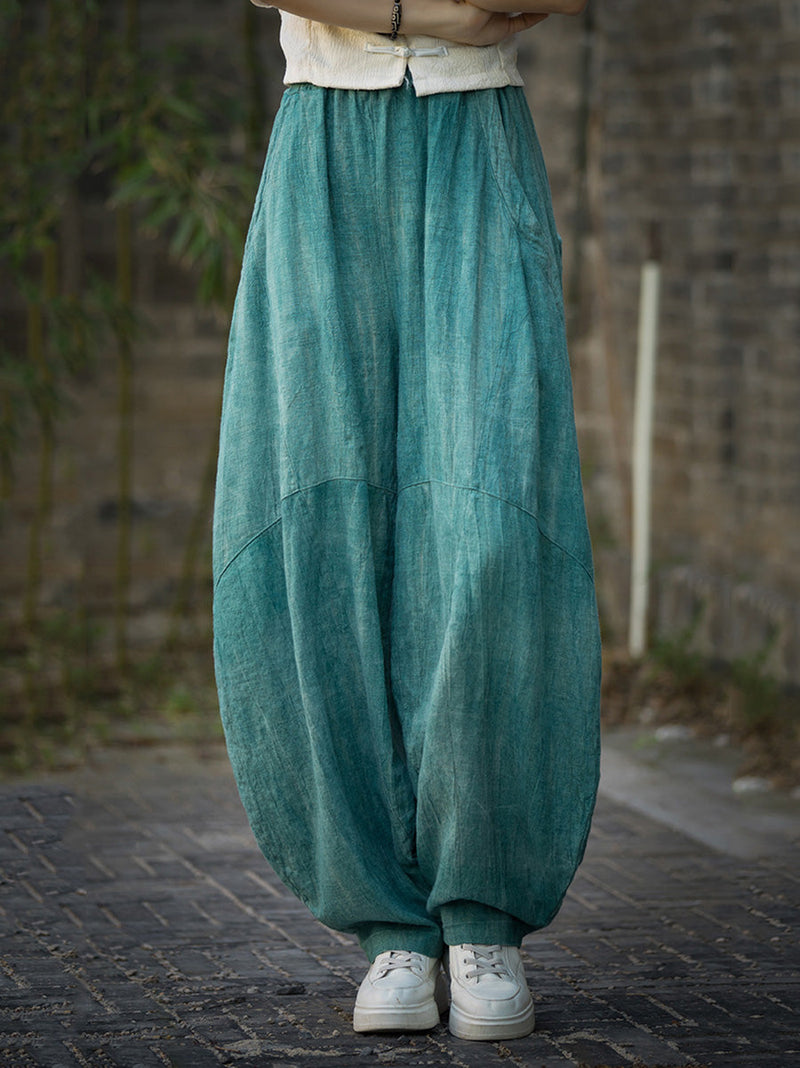 This product is made of 80%Ramie20%Cotton. featuring a retro and artsy style. The elastic waist and tie-dye pattern on these bloomers make for a comfortable fit and unique look. With an ankle-length design. these pants are perfect for the spring and summer season.