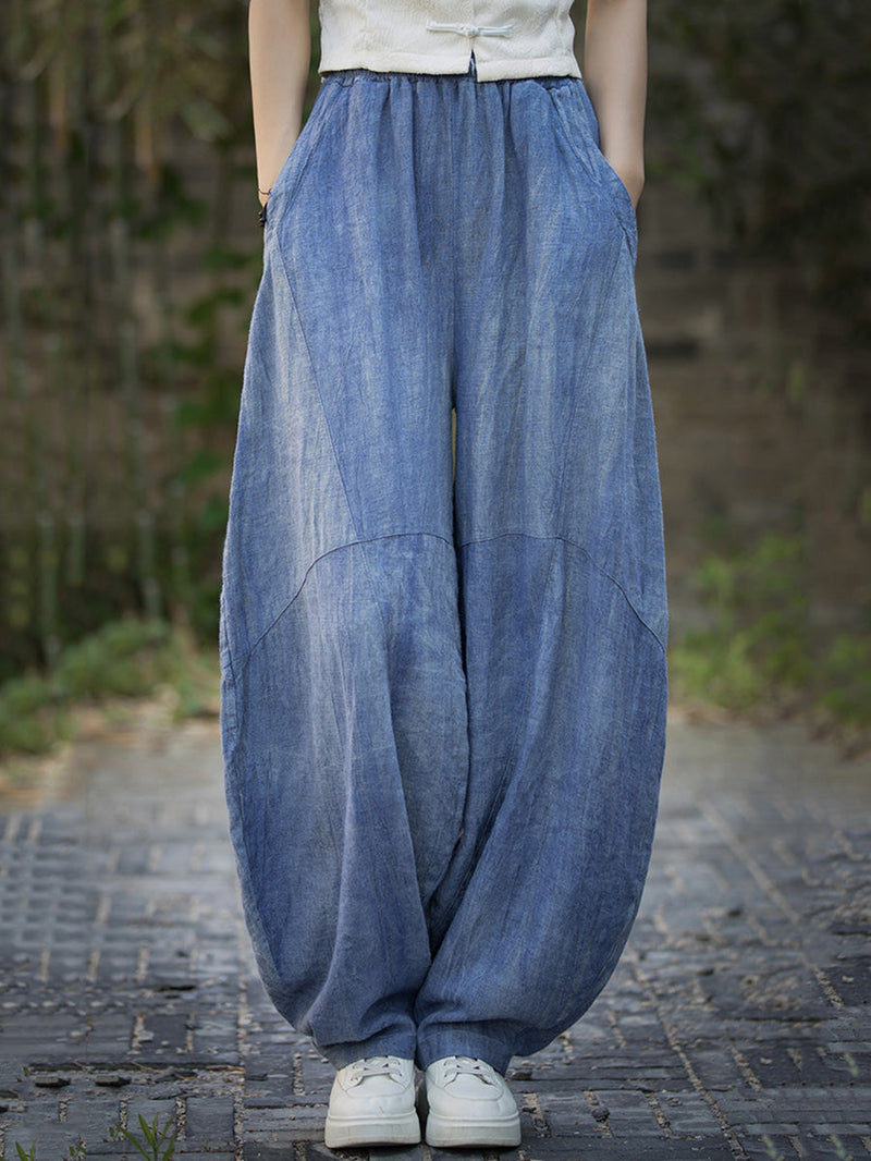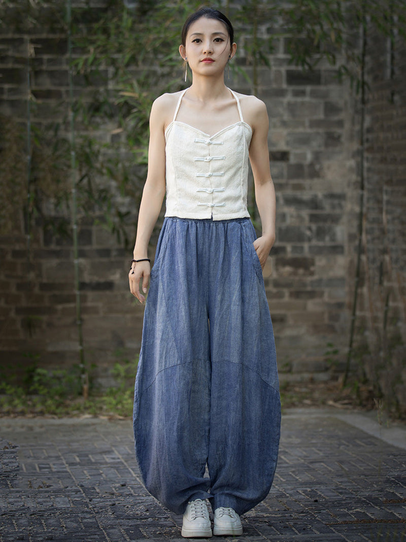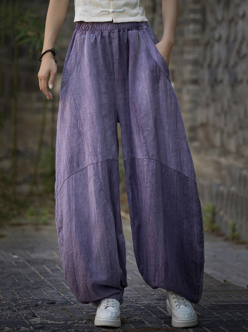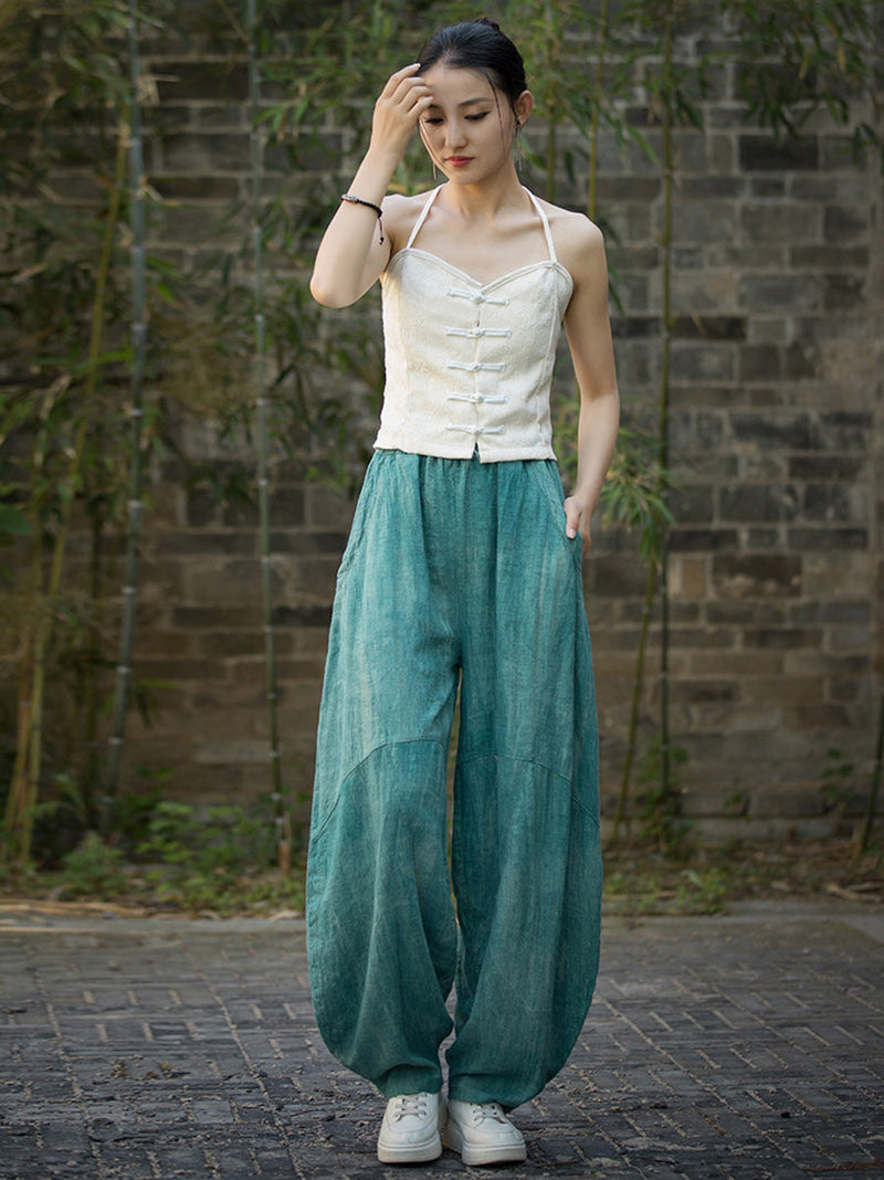 This product is made of 80%Ramie20%Cotton. featuring a retro and artsy style. The elastic waist and tie-dye pattern on these bloomers make for a comfortable fit and unique look. With an ankle-length design. these pants are perfect for the spring and summer season.