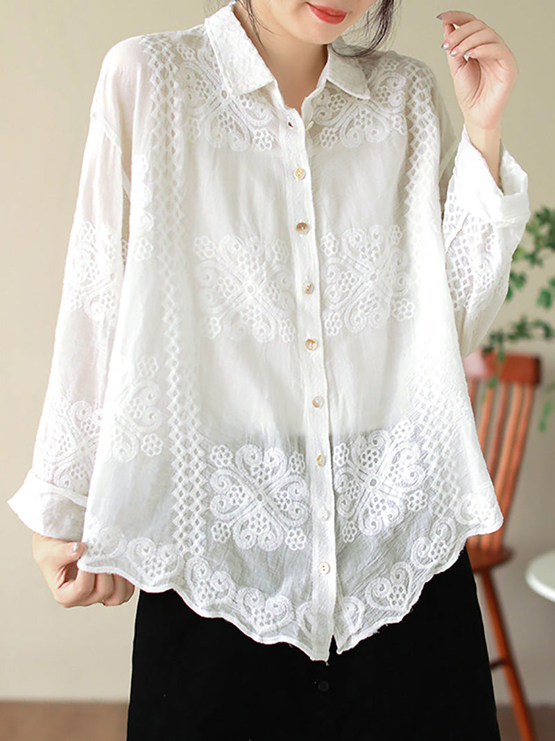 This garment features a stunning flower pattern. The turn-down collar and full. regular sleeves add elegance and style to this artsy piece. perfect for the spring and summer seasons.