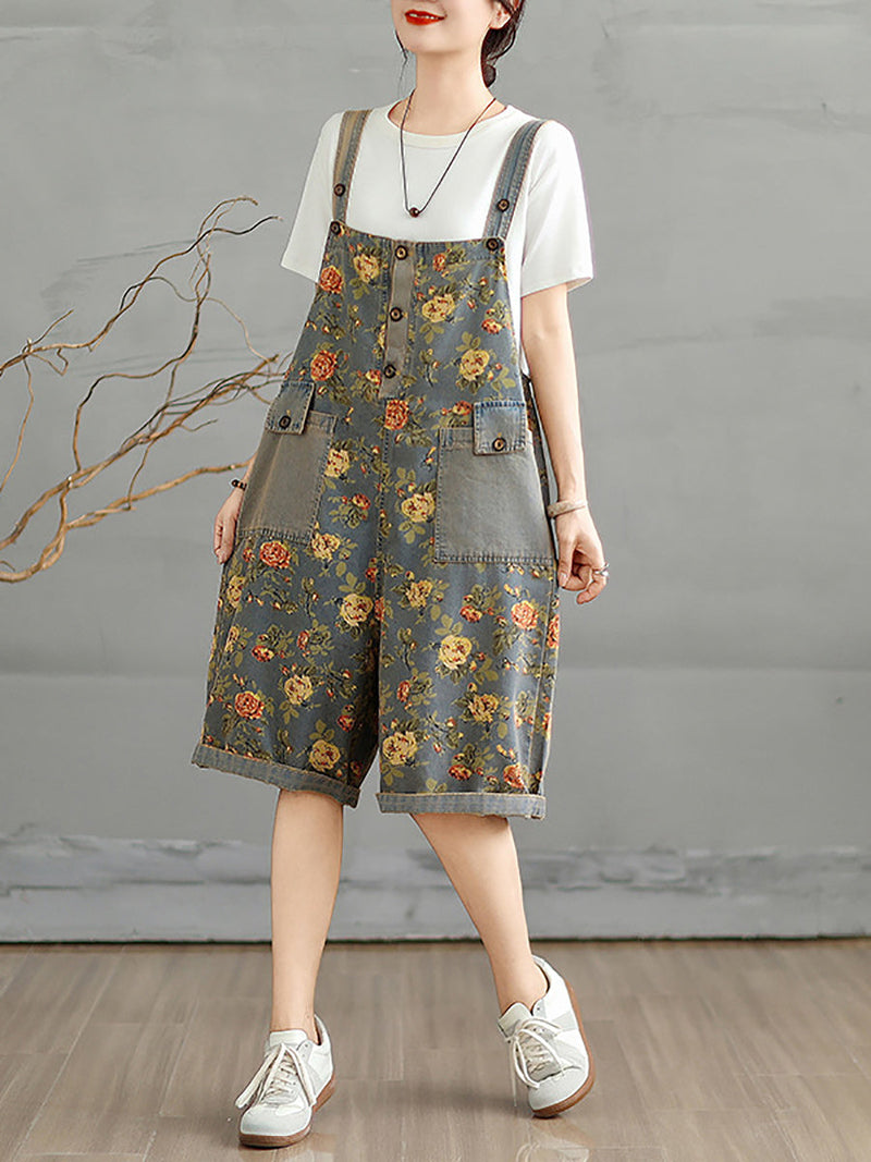Women Summer Artsy Flower Denim Short Jumpsuits