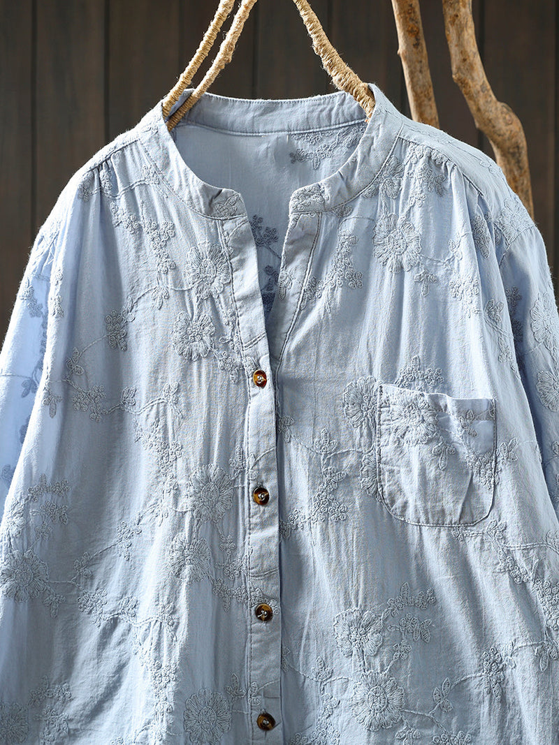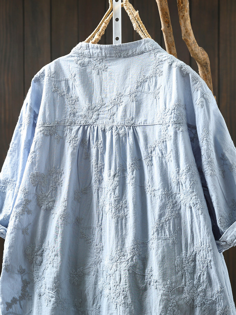 Women Summer Artsy Flower Embroidery V-Neck 100%Cotton Shirt