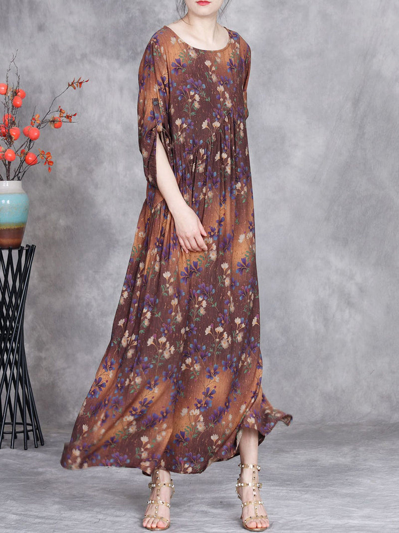 Women Summer Artsy Flower O-Neck Maxi Dress