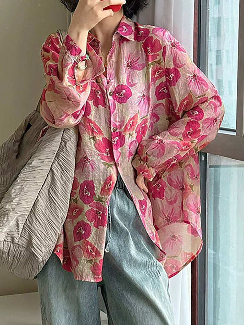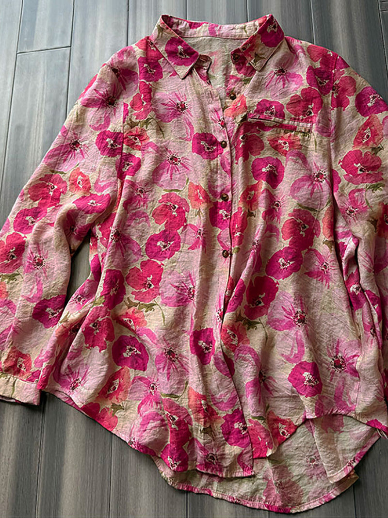 Plus Size Women Summer Artsy Flower Turn-down Collar Shirt