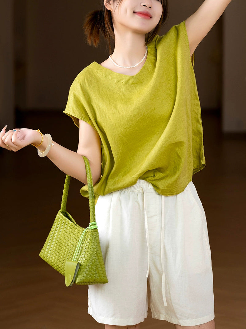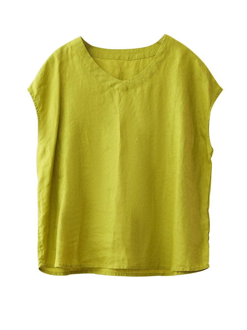 Women Summer Artsy Pure Color V-Neck 100%Linen Shirt