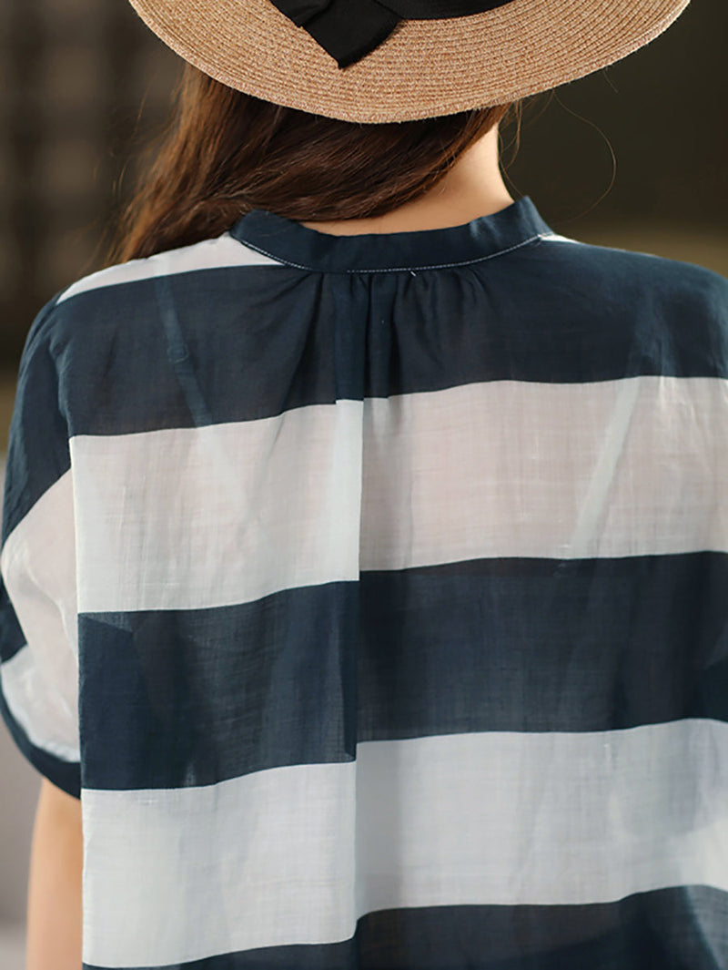 Women Summer Stripe Stand Collar 100%Ramie Thin Shirt