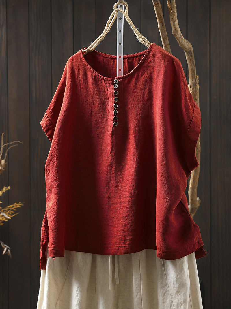 Plus Size Women Summer Casual Pure Color O-Neck 100%Linen Shirt