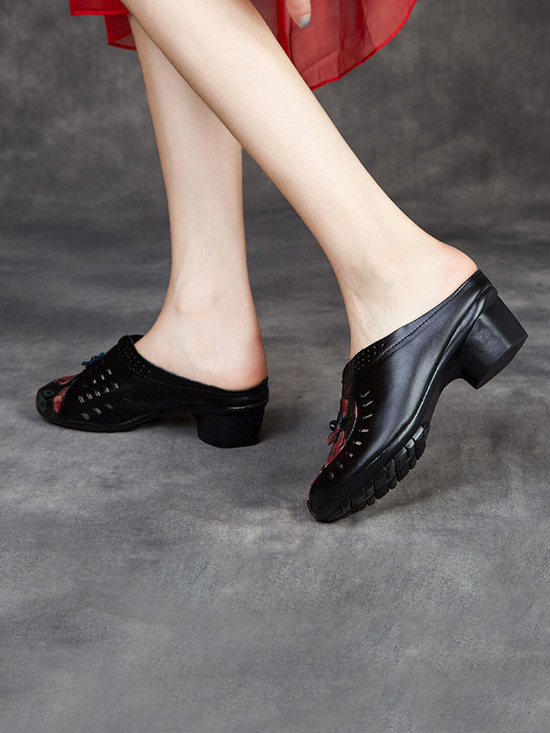 Women Summer Ethnic Flower Leather Spliced Mid Heel Slippers