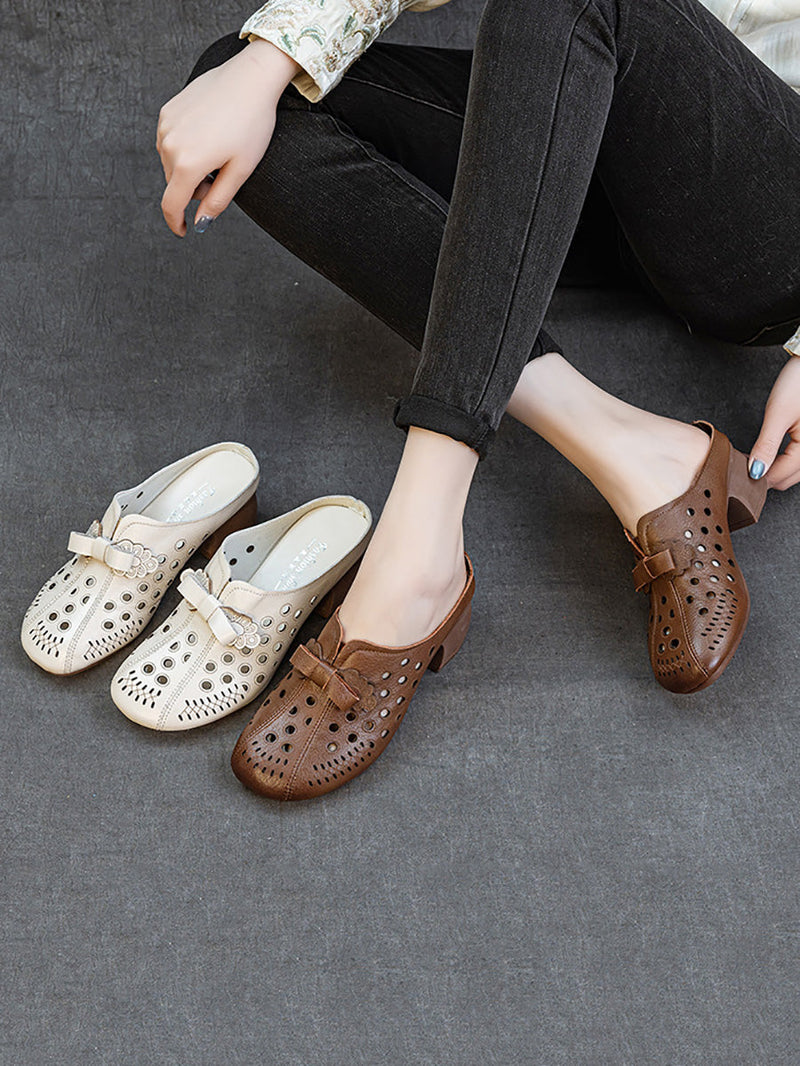 Women Summer Genuine Leather Hollow Out Mid Heel Slippers