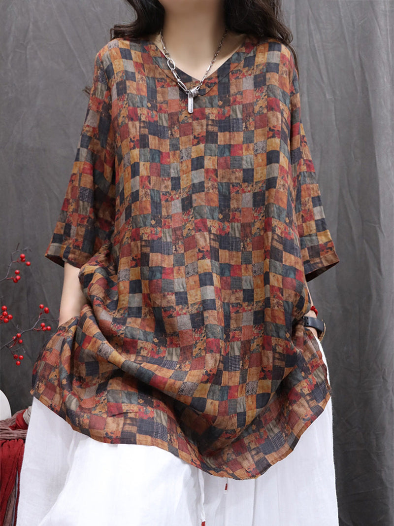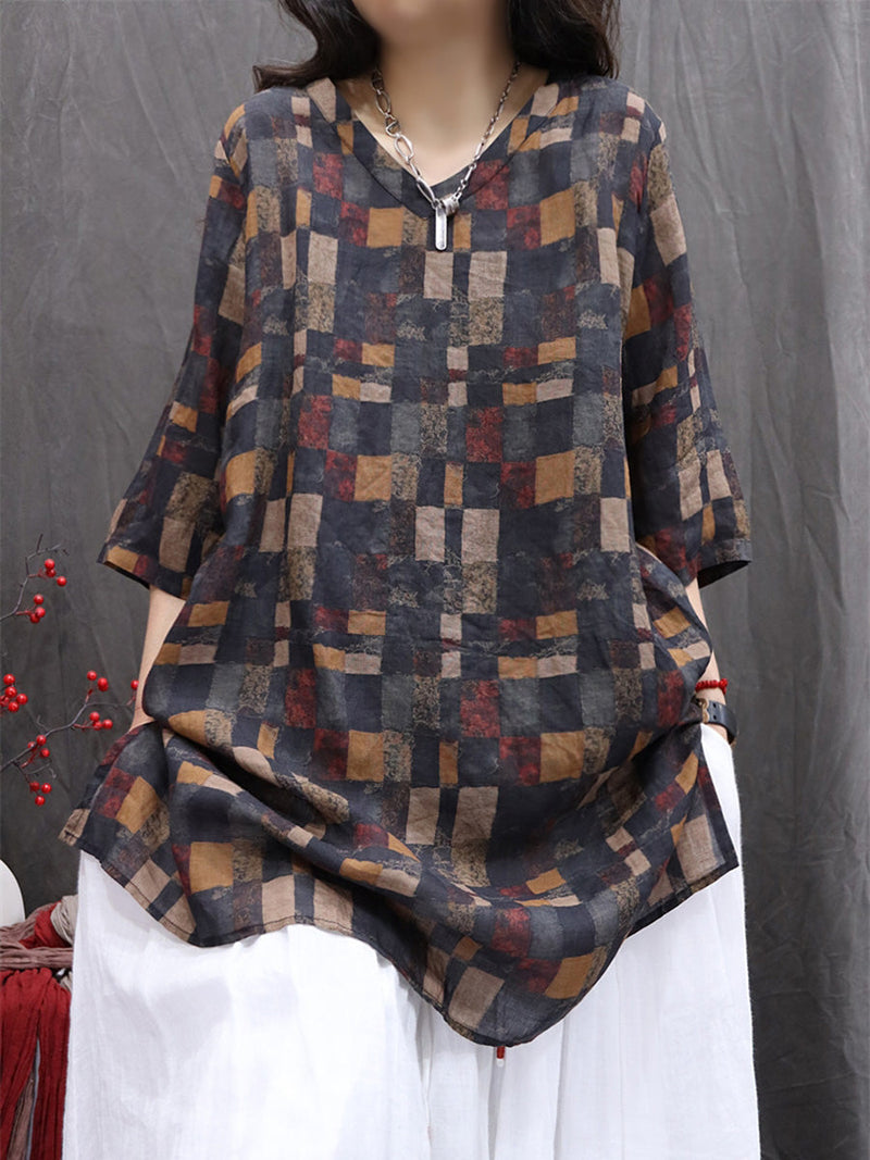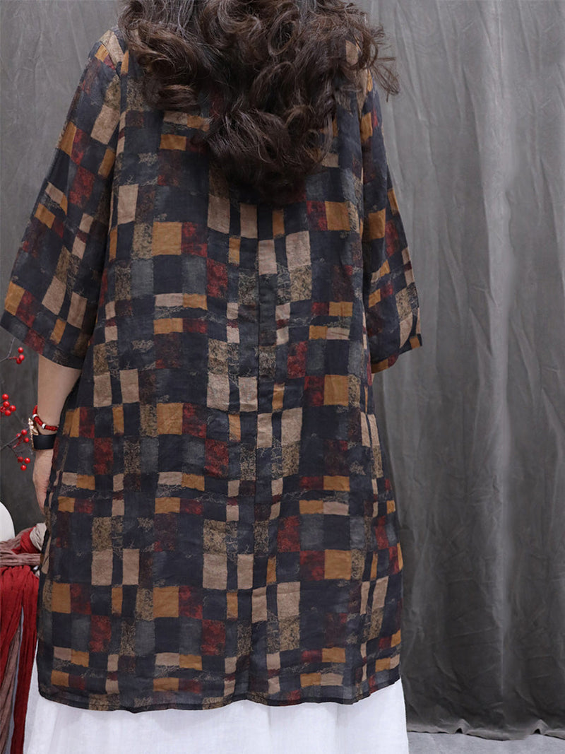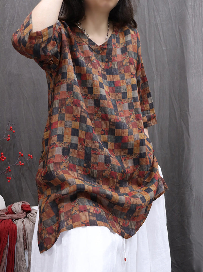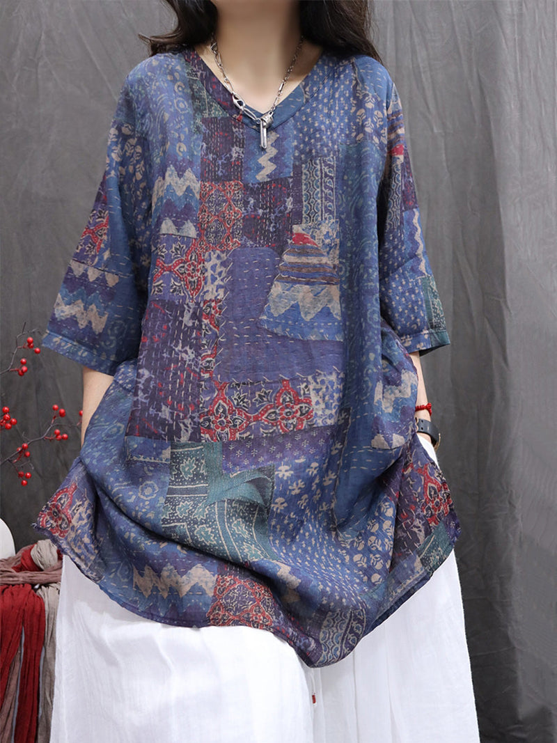 Women Summer Print V-Neck 100%Ramie Thin Long Shirt