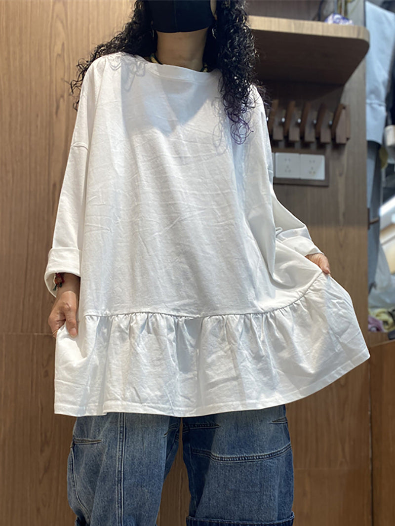Plus Size Women Spring Pure Color Ruffles Hem Cotton Shirt