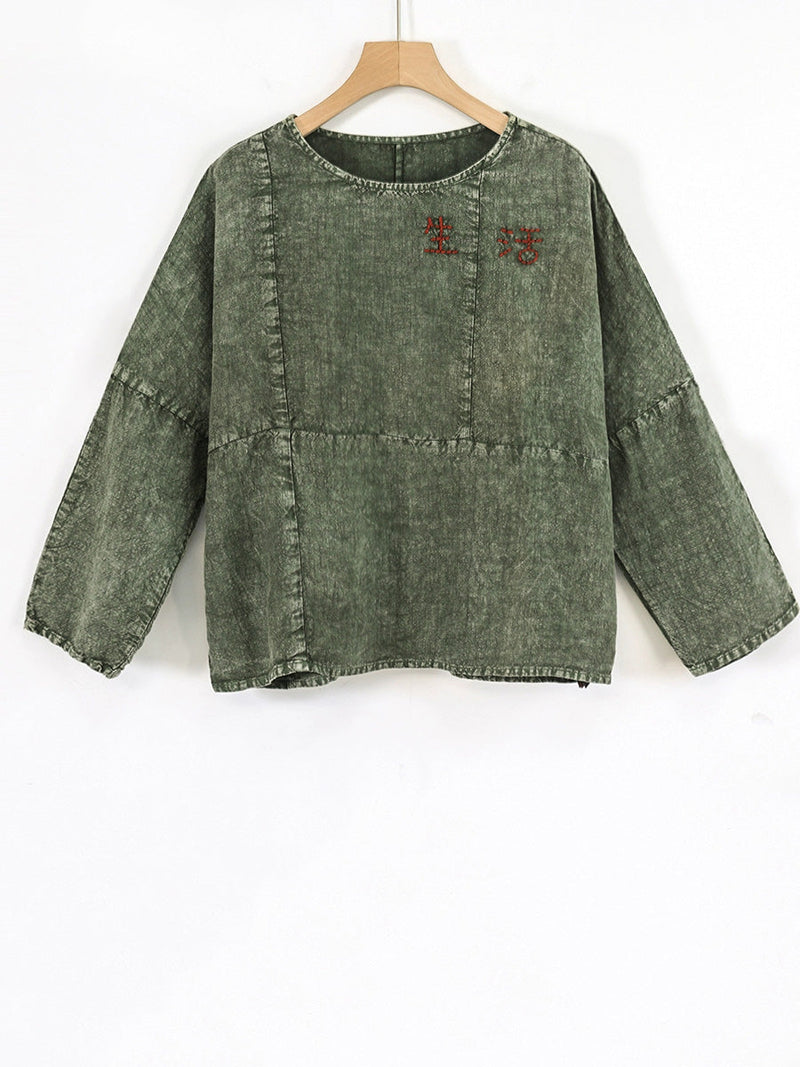 Women Summer Retro Embroidery O-Neck 100%Linen Shirt