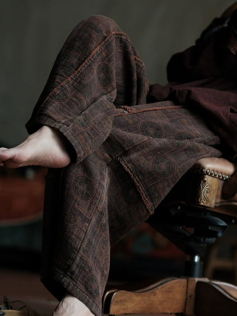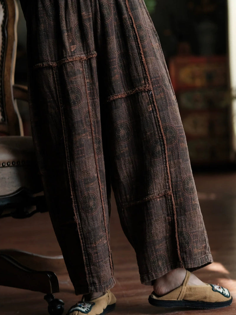 Women Summer Retro Print Spliced Cotton Wide-leg Pants