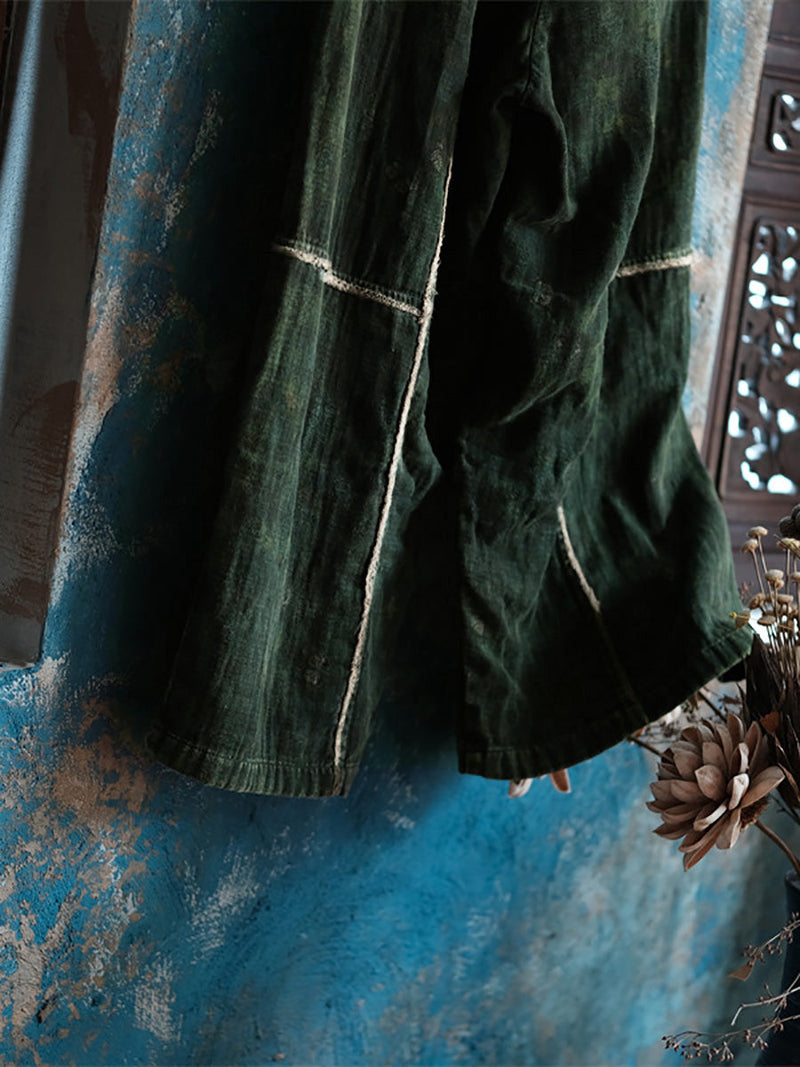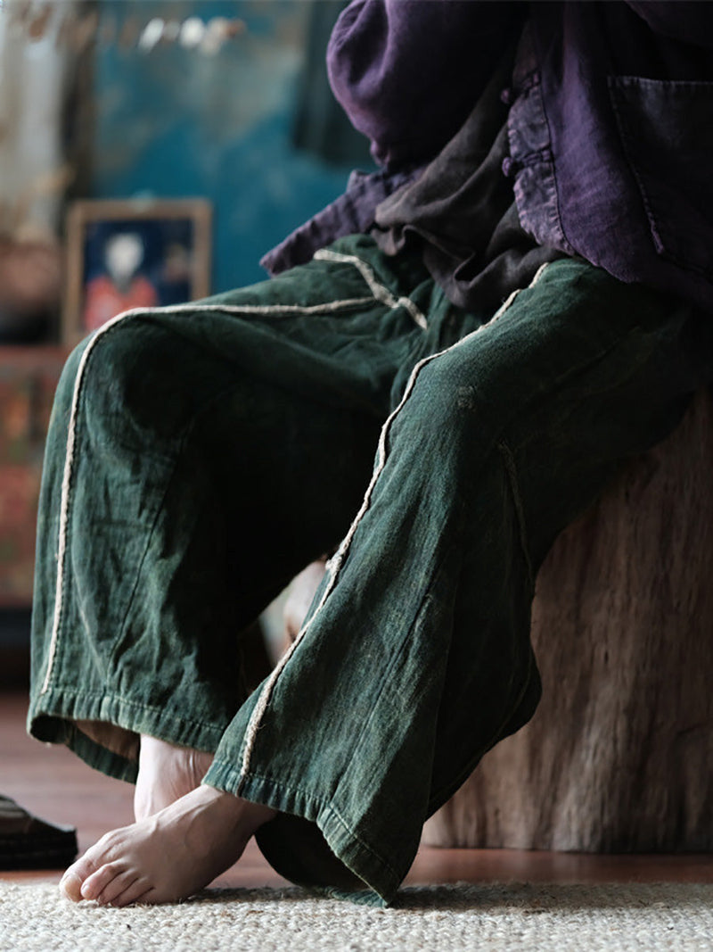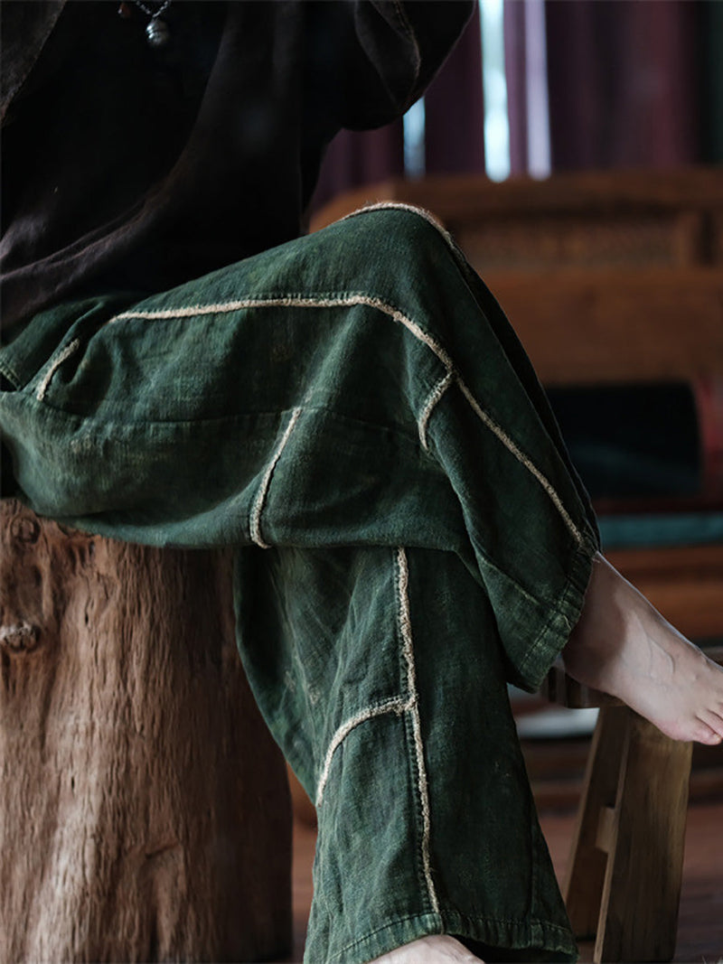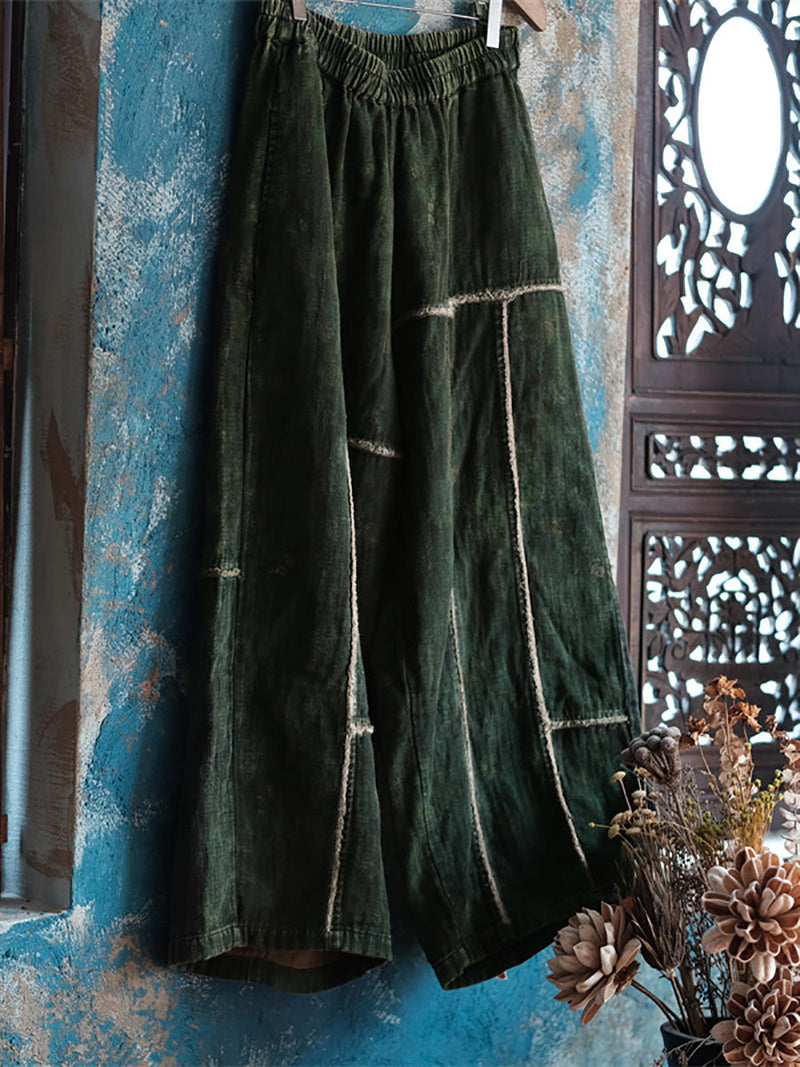 This garment's fabric is made entirely of 100% cotton. providing a vintage and timeless feel. The elastic waist offers comfort and ease of movement. while the spliced pattern adds a unique touch. With pockets and a patch detail. these wide-leg pants are perfect for the spring and summer seasons.