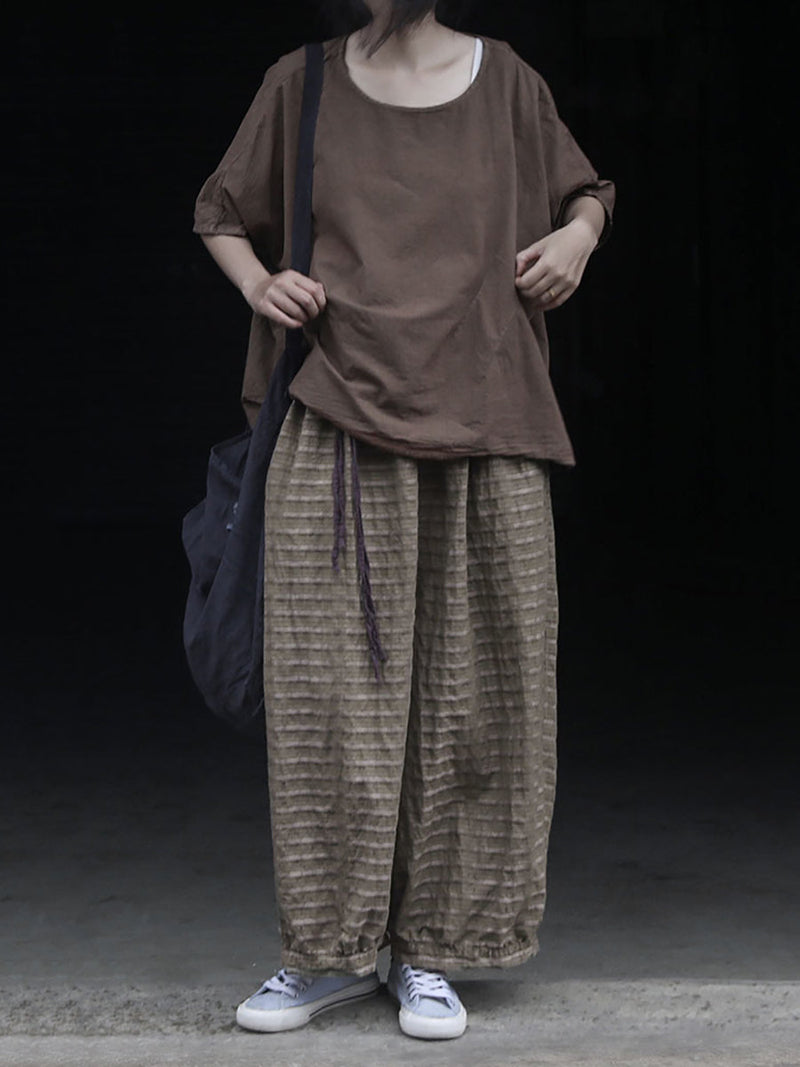 Women Summer Retro Stripe Ramie Wide-leg Pants