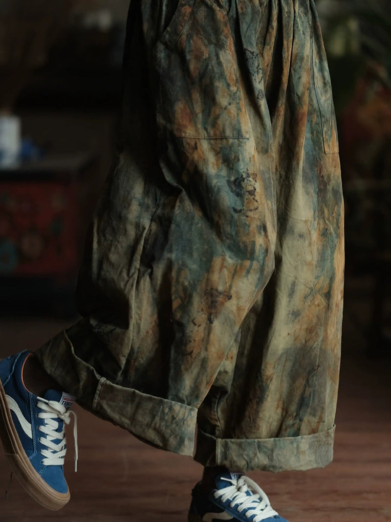 Women Summer Retro Tie-dye Cotton Wide-leg Pants