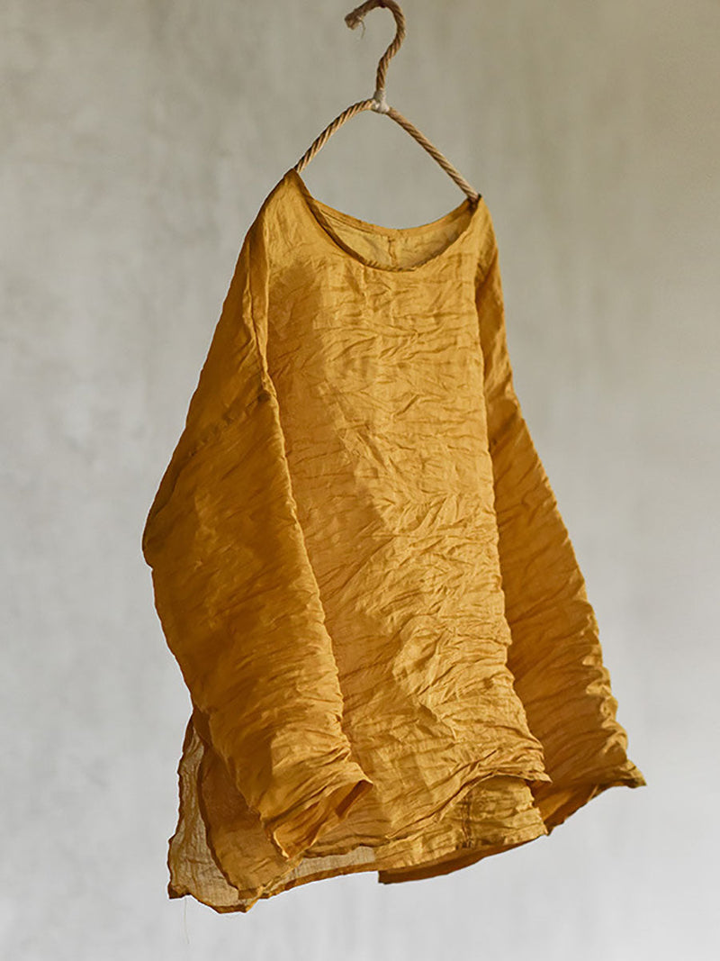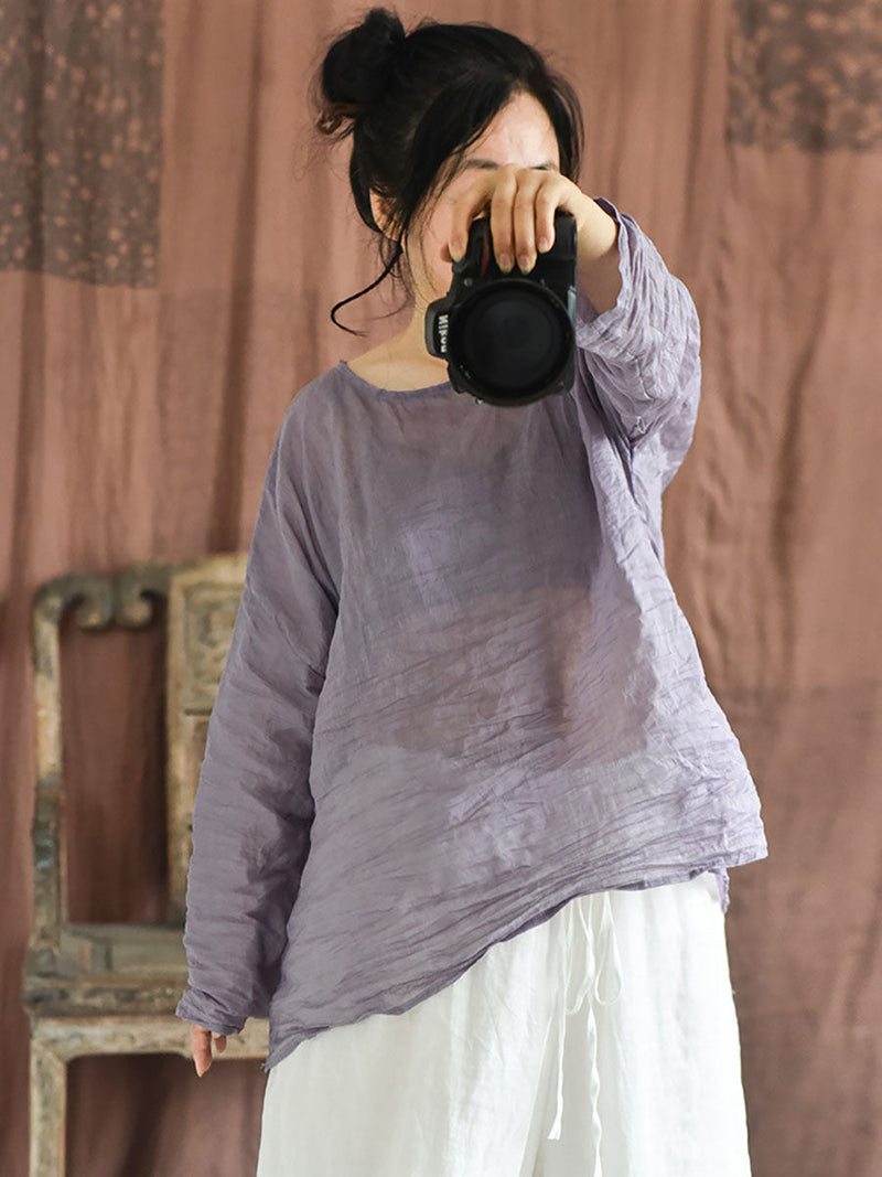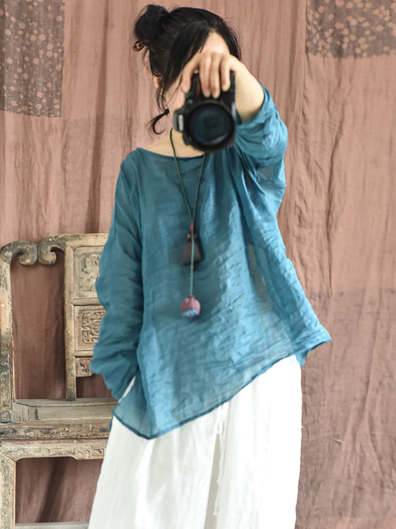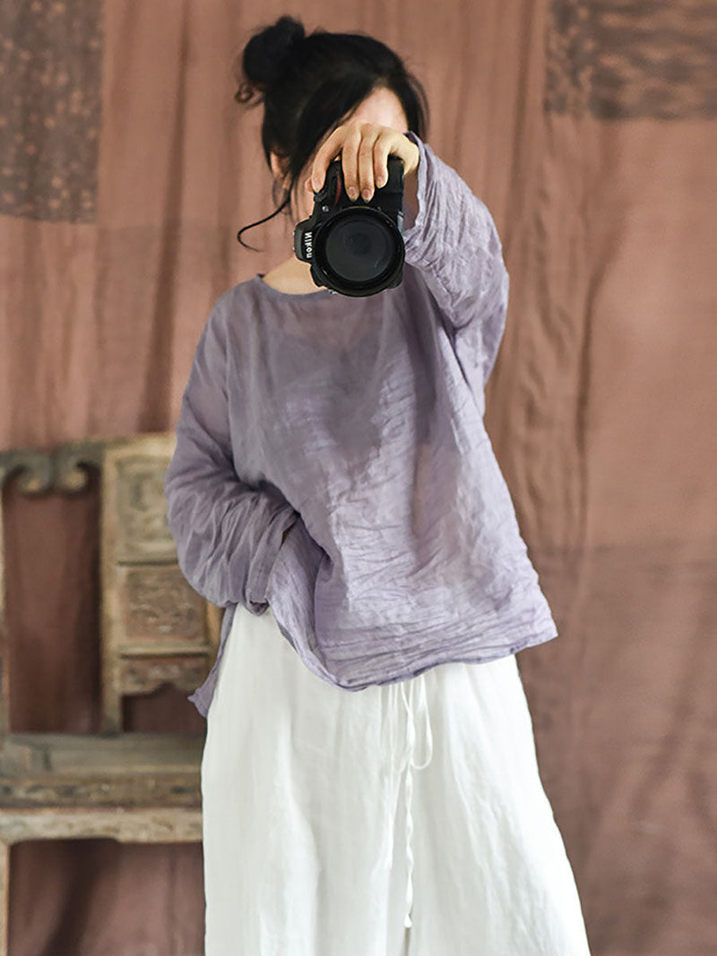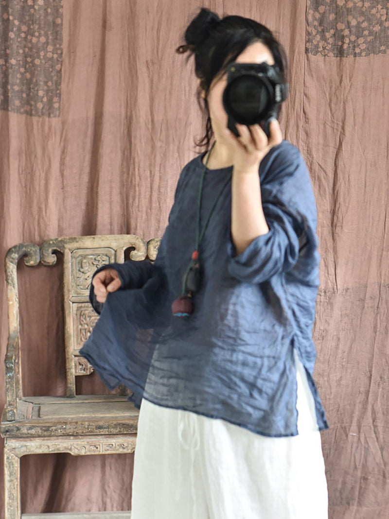 Plus Size Women Summer Solid Vintage O-Neck Split Hem Ramie Shirt