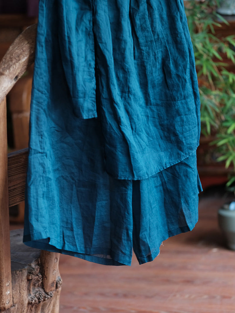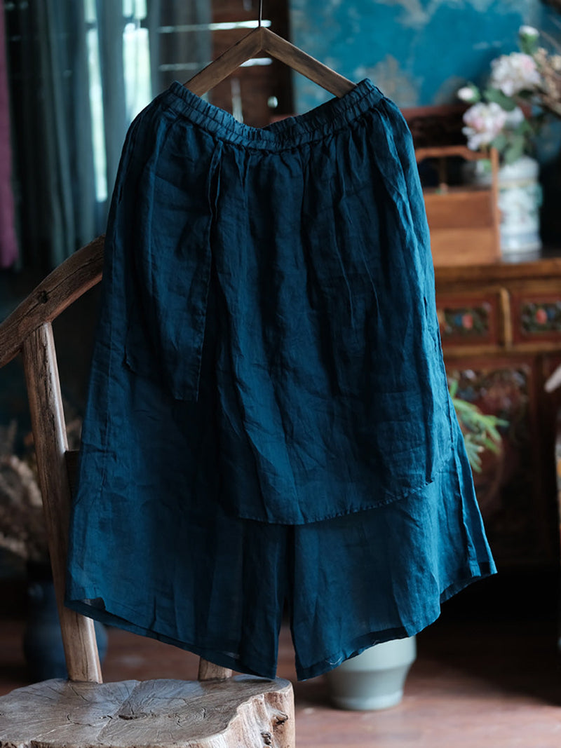 Crafted from 100% Ramie material. these Women Summer Vintage Solid Spliced Wide-leg Pants feature a retro style with an elastic waist and a full length design. Perfect for spring and summer seasons.