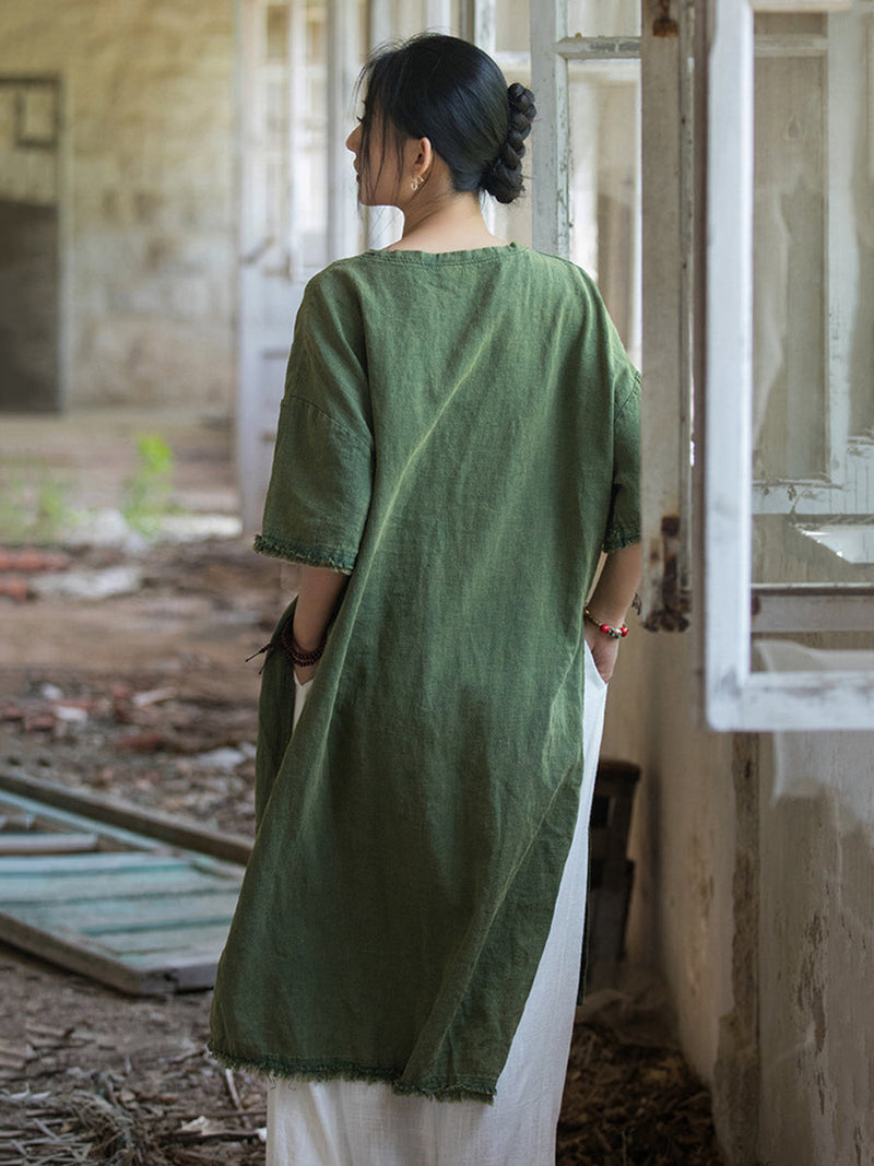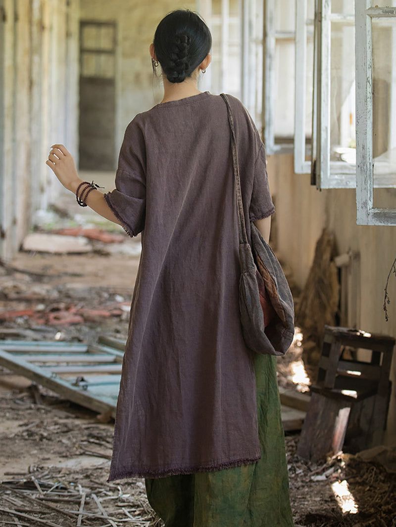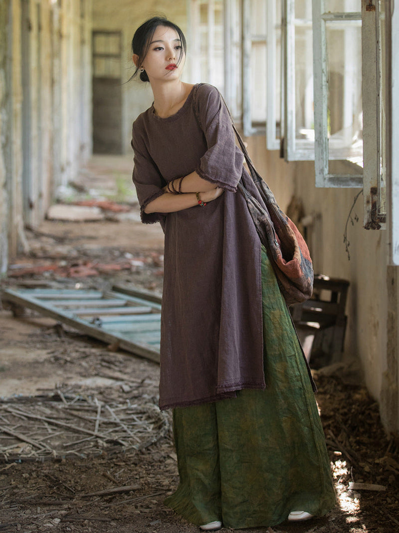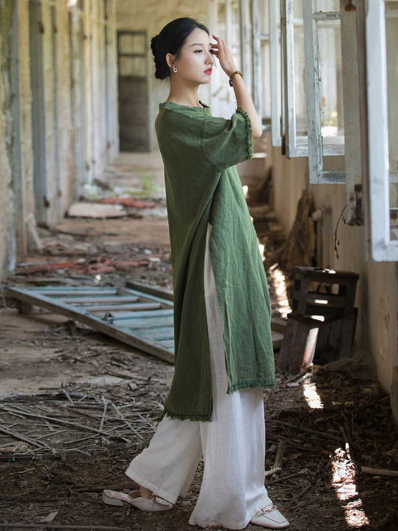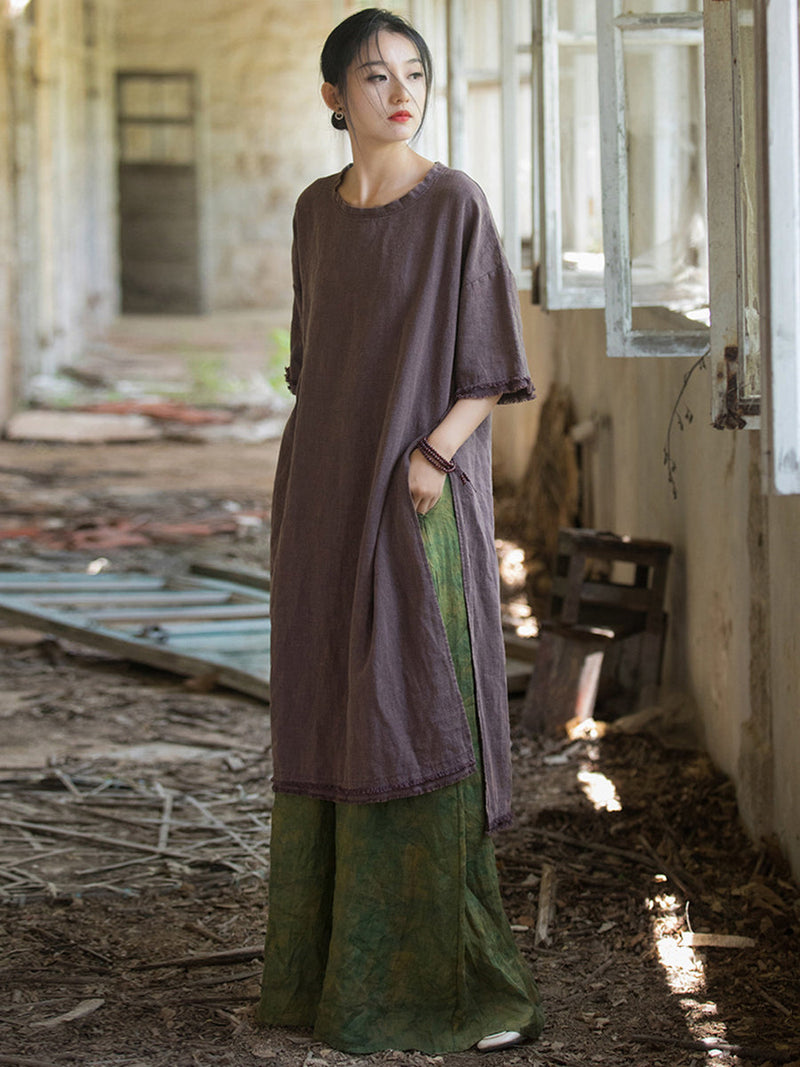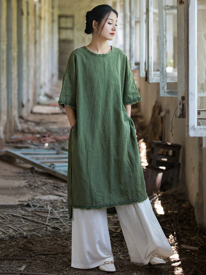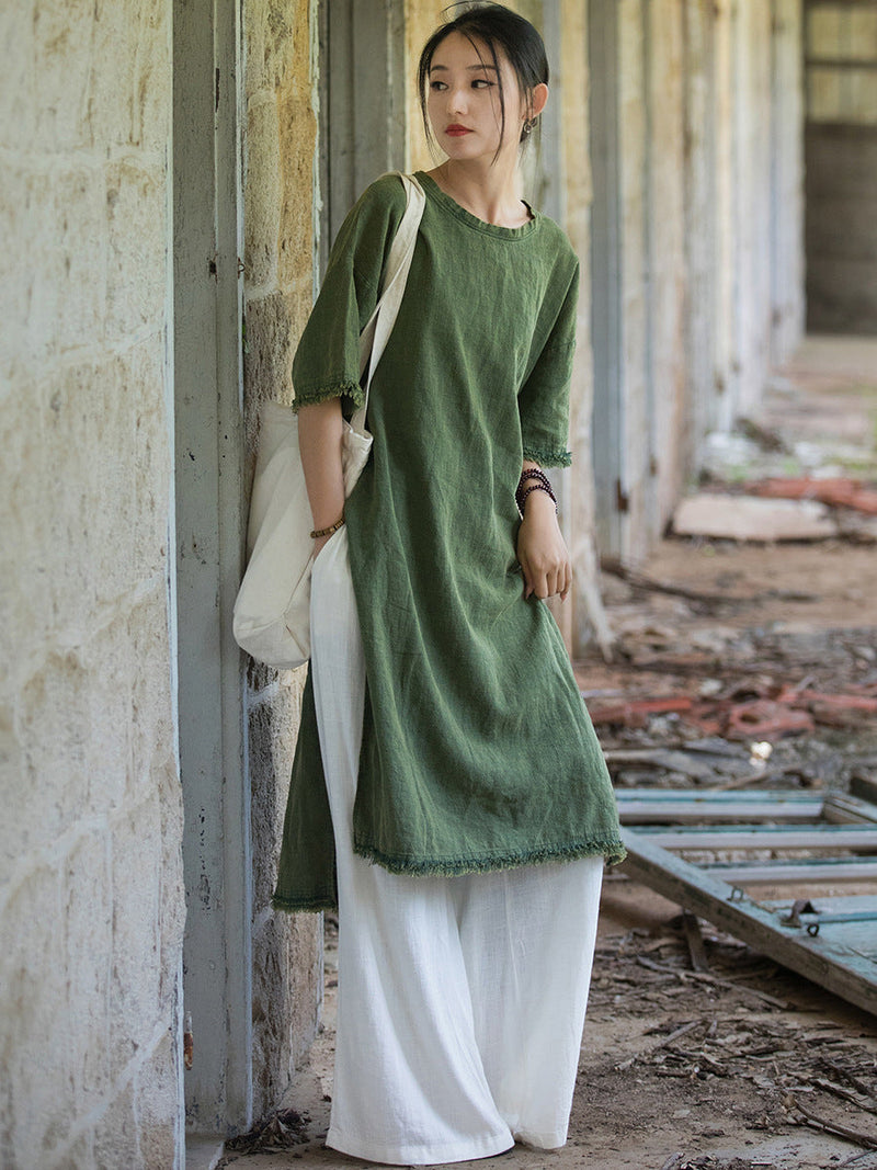This dress is designed to keep you cool during summer while maintaining a fashionable look. with its knee-length design. solid pattern. O-Neck collar. and split hem detail.