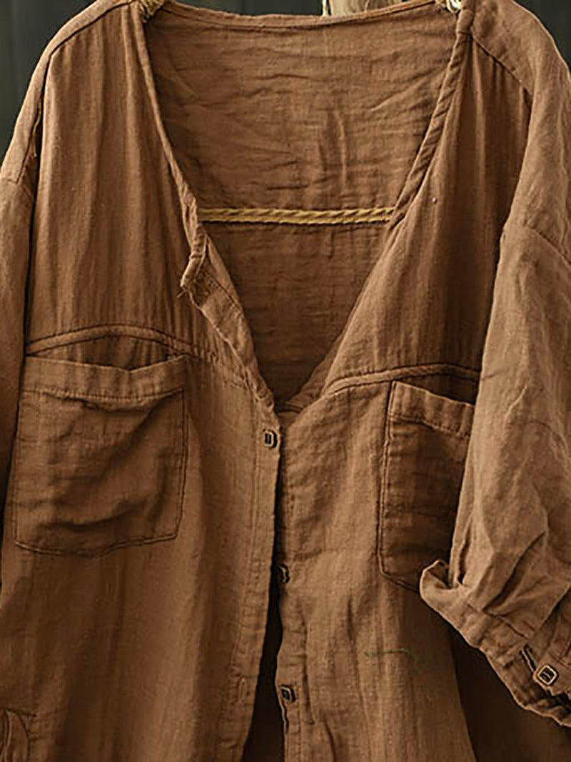 Plus Size Women Summer Worn Pure Color V-Neck Cotton Shirt