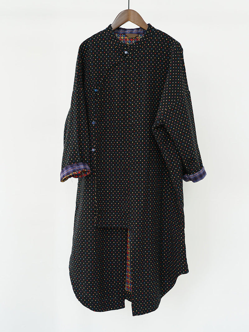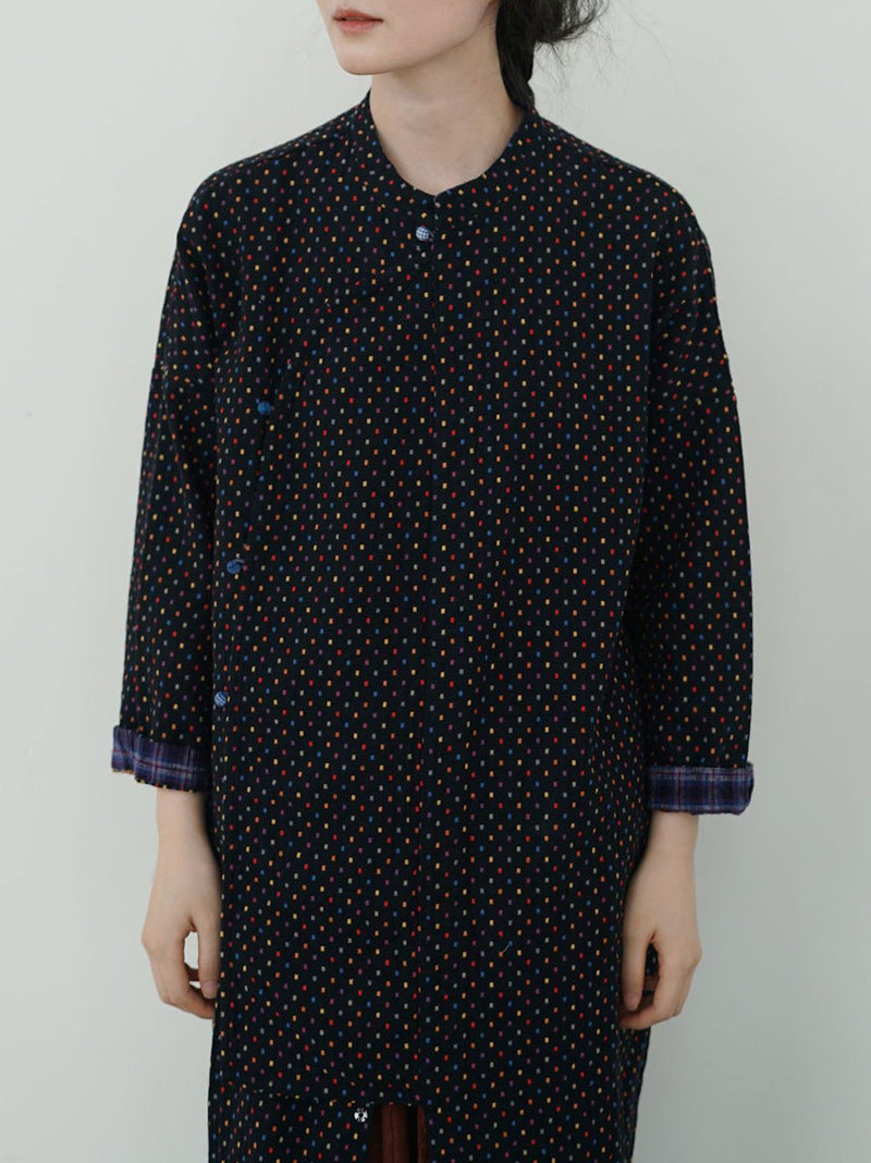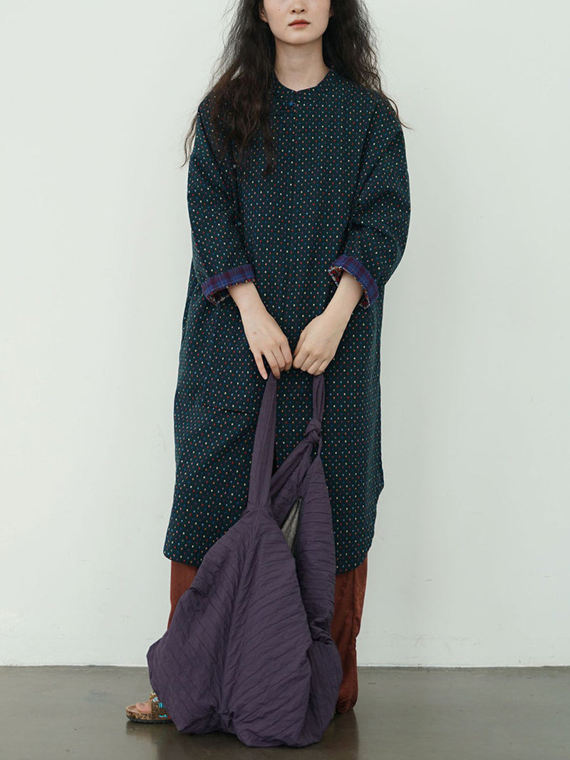 The fabric used for this dress is cotton. and it features a stand collar and a dot pattern. The sleeves are of the raglan type and they are full length. reaching the knee. The dress also includes a buckle and is perfect for wearing during the spring and autumn seasons.