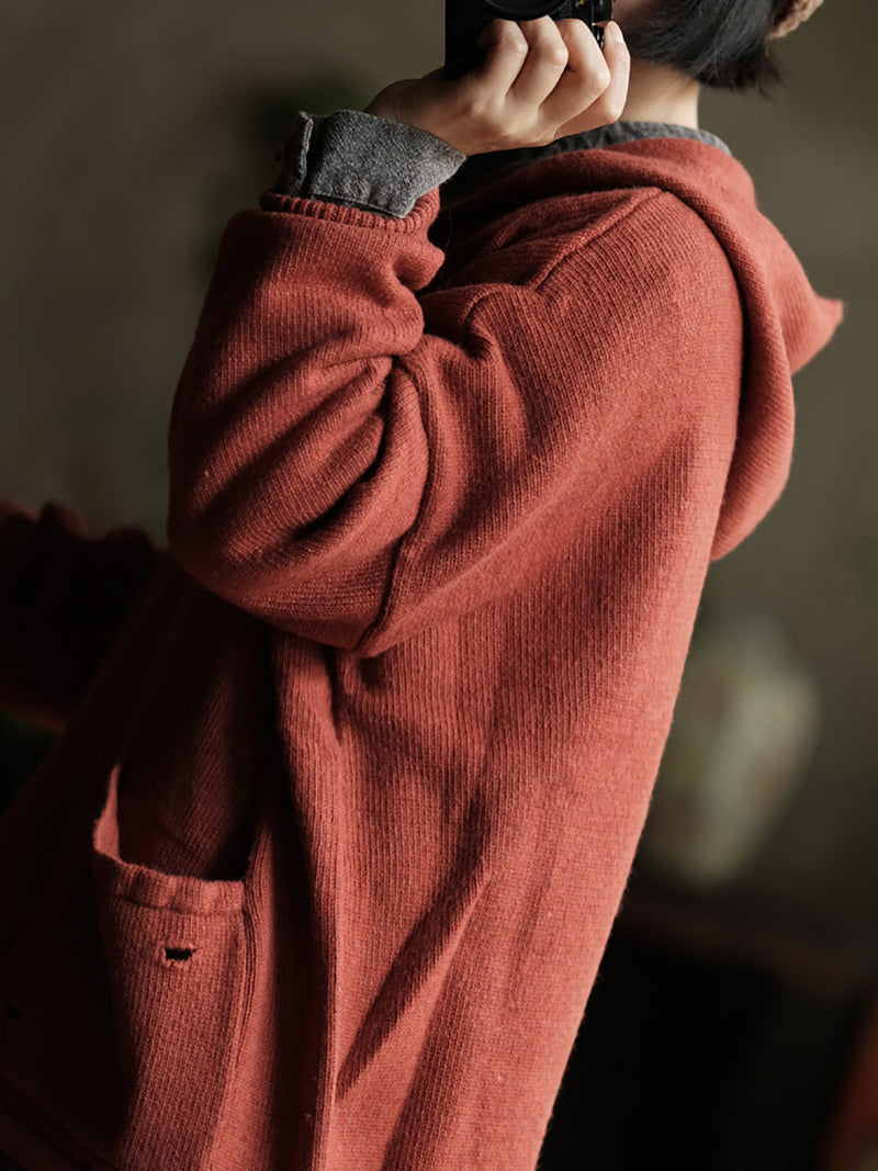 This Women Vintage Autumn Frayed Solid Hooded Knit Sweater boasts a pure color pattern. a hooded collar. and full raglan sleeves. Perfect for a casual. yet stylish look during the spring and autumn seasons.