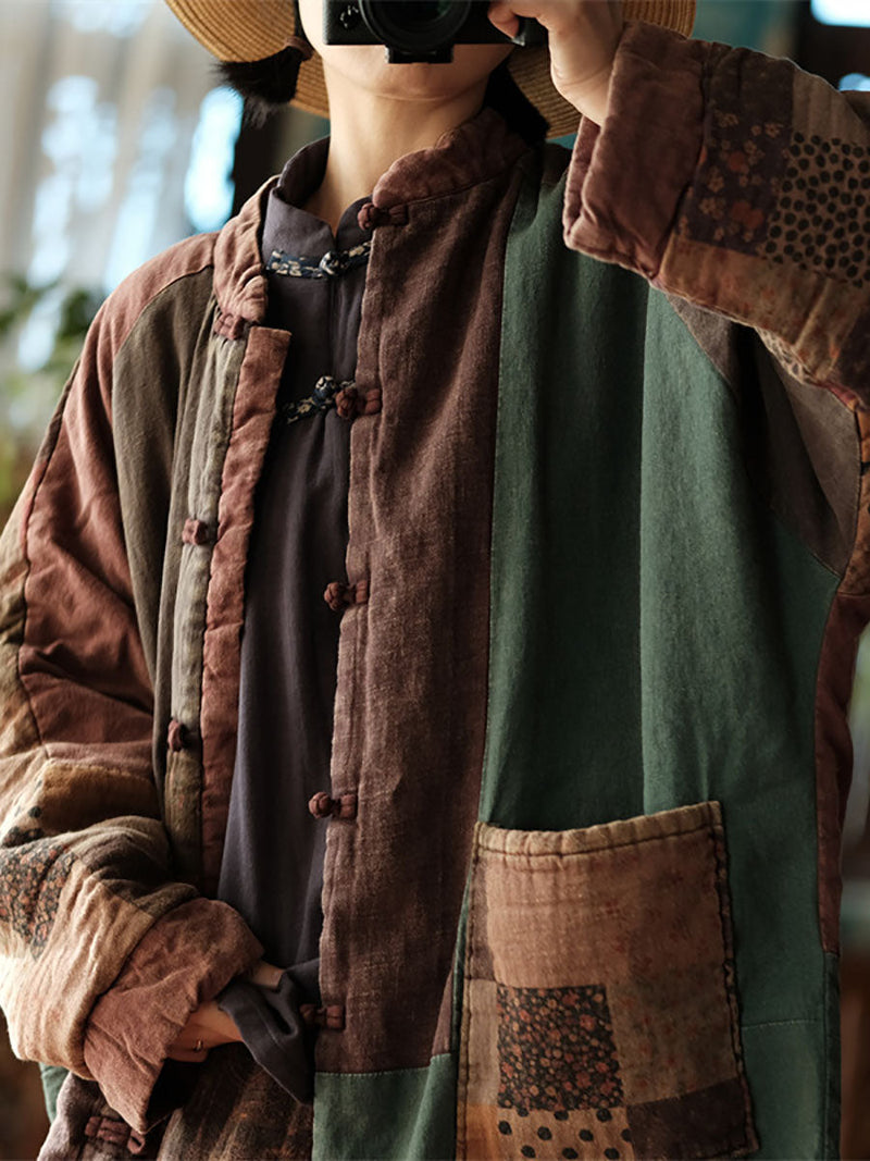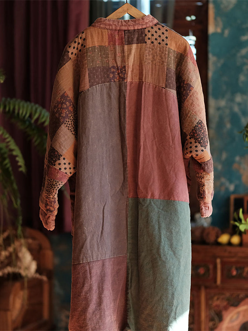 This Women Vintage Autumn Patch Spliced Long Cotton Robe Coat is carefully crafted with a blend of cotton and linen. featuring a unique patchwork pattern. The full raglan sleeves add a touch of ethnic style to this coat. making it perfect for the autumn and winter seasons.