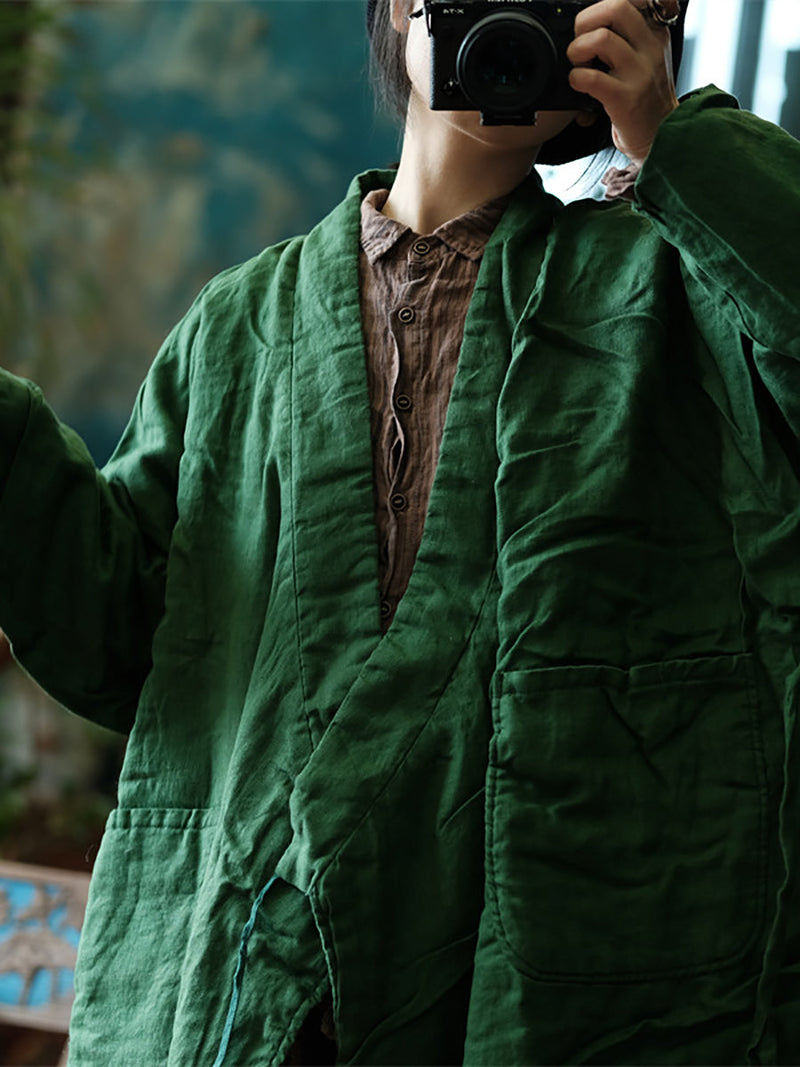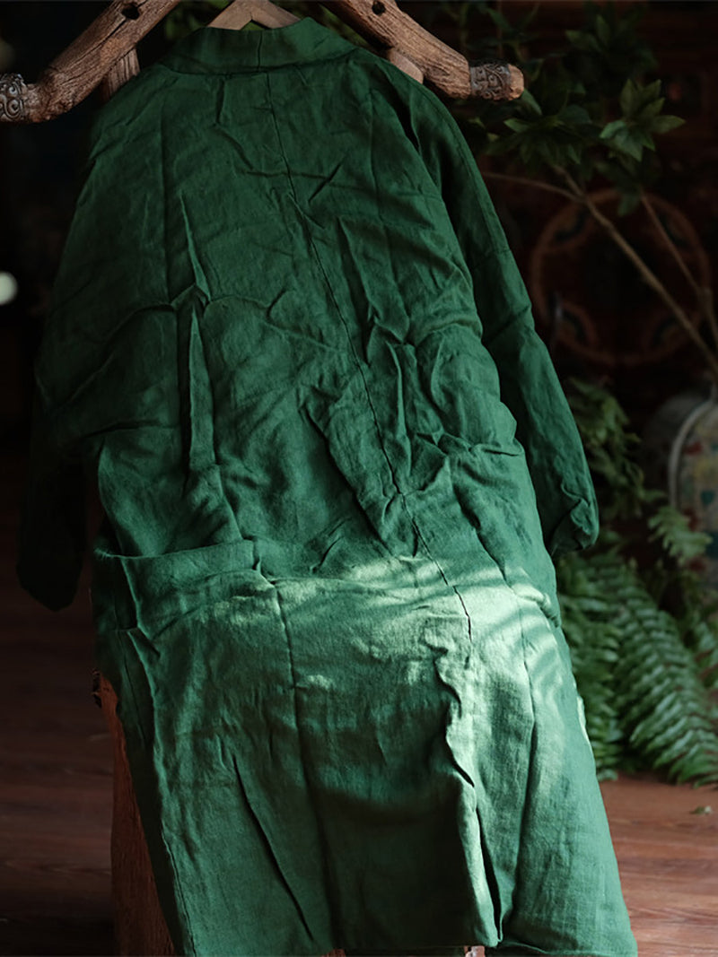 Crafted from 100% linen. this elegant robe coat boasts a solid pattern. full raglan sleeves. and an ethnic style perfect for the autumn and winter seasons.