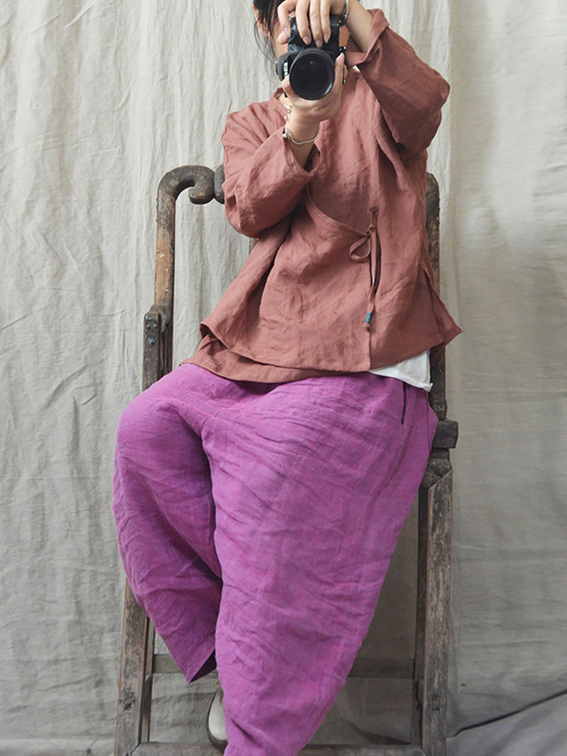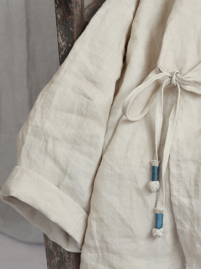 Women Vintage Autumn V-Neck Strap Loose Linen Blouse