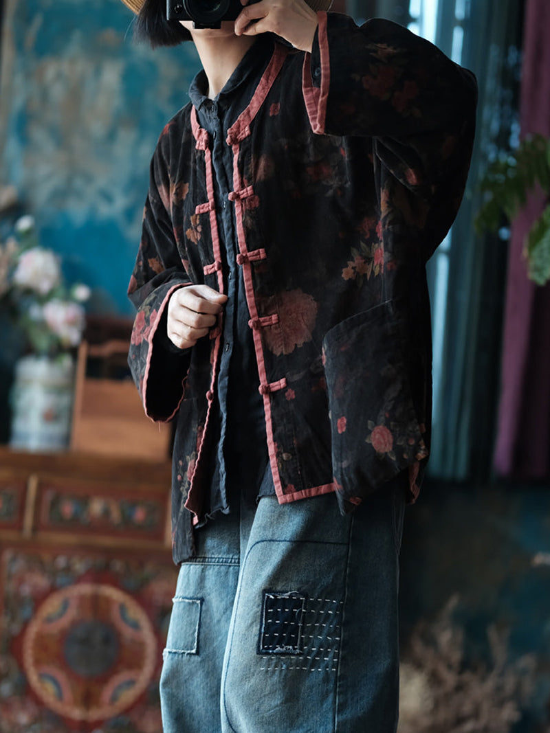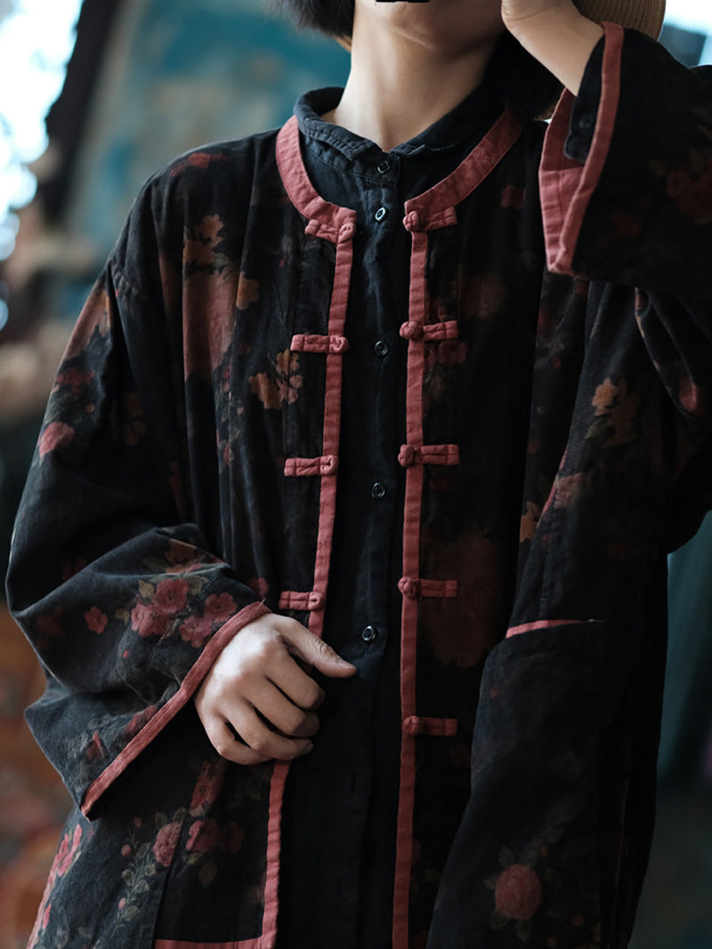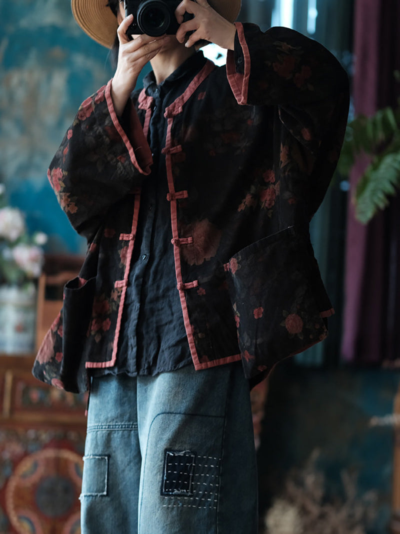 Women Vintage Flower Button-up 100%Cotton Shirt