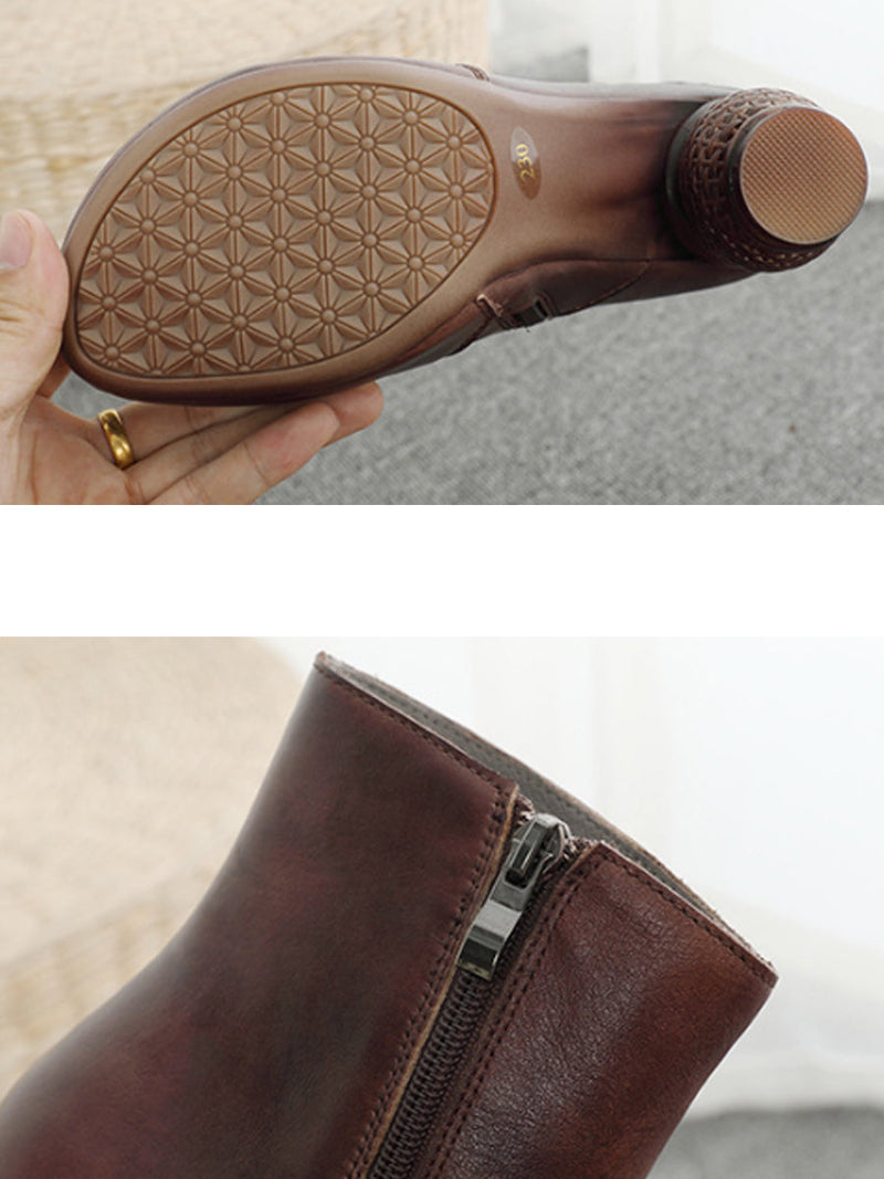 Women Vintage Flower Genuine Leather Mid Heel Ankle Boots