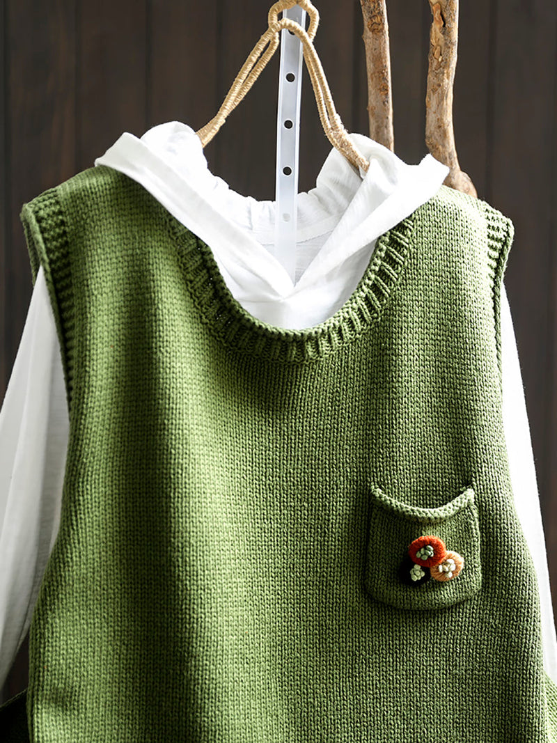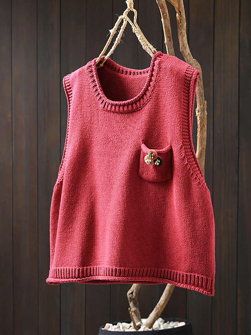 Women Vintage Flower Pocket O-Neck Knit Vest