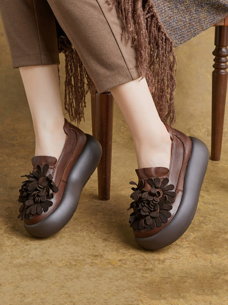 Women Vintage Flower Spliced Genuine Leather Platfrom Shoes