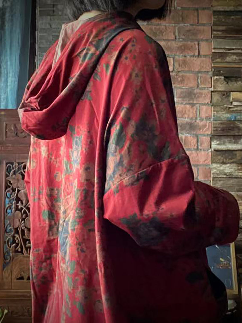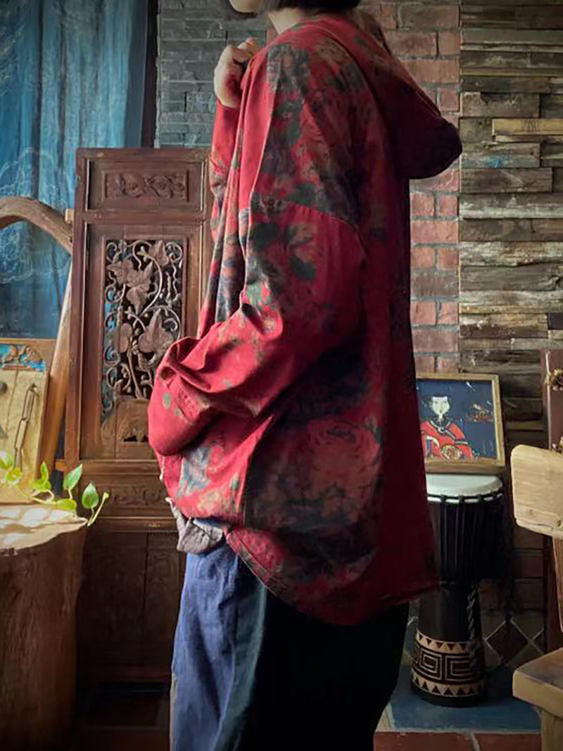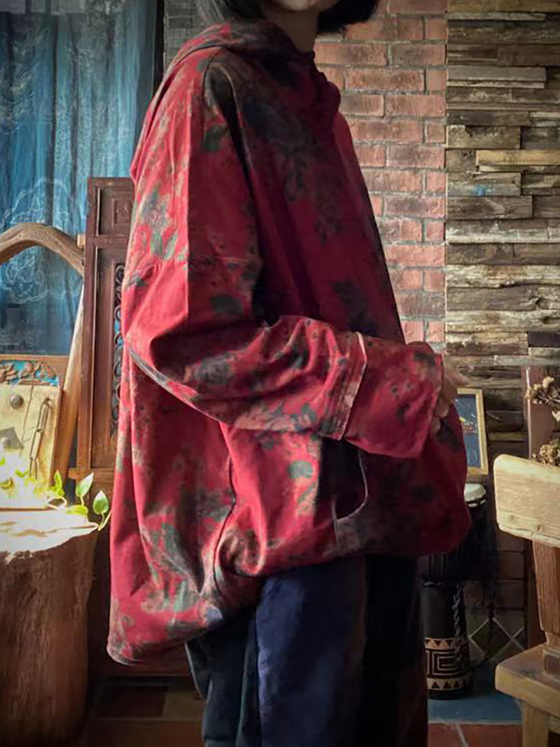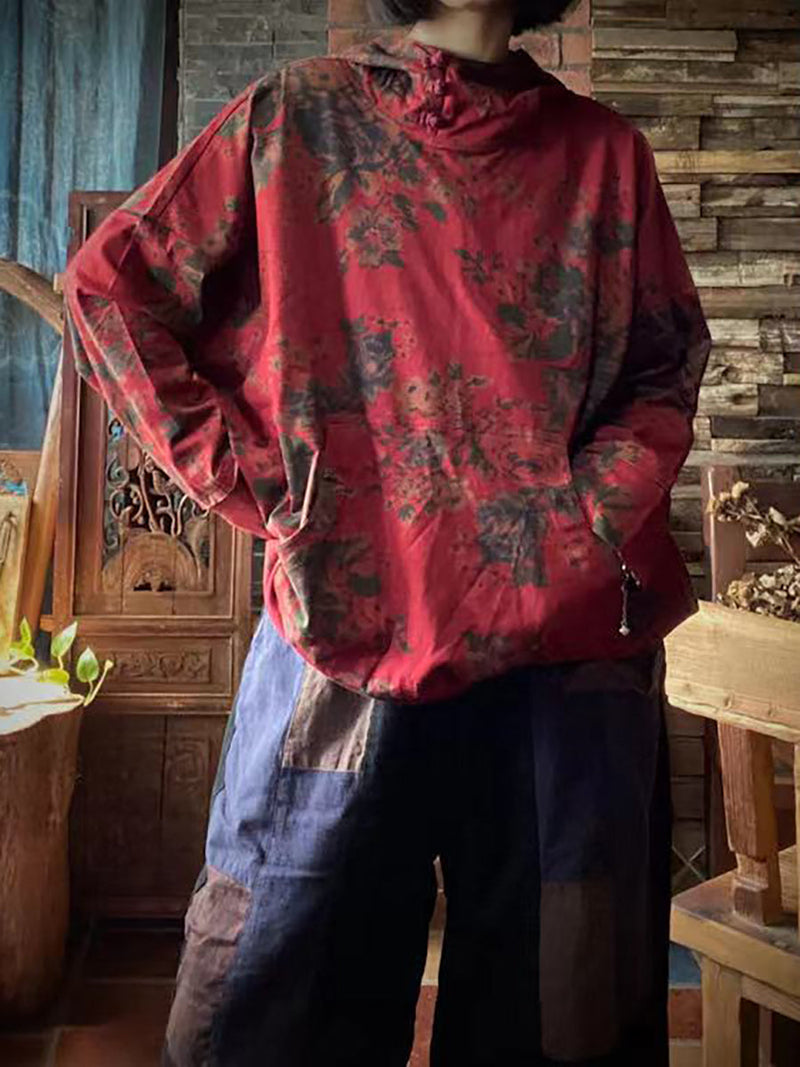 Plus Size Women Vintage Print Cotton Hooded T-Shirt
